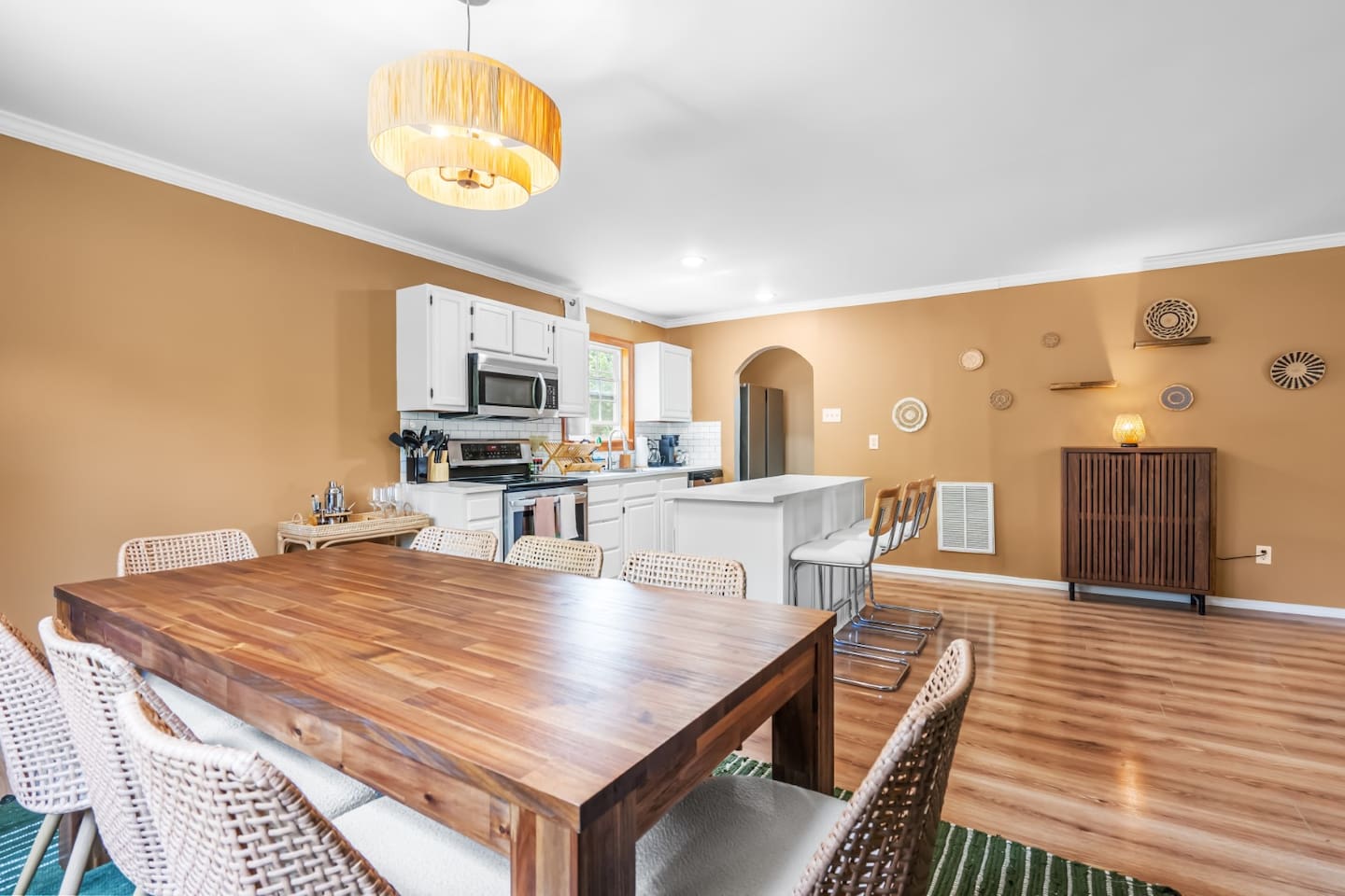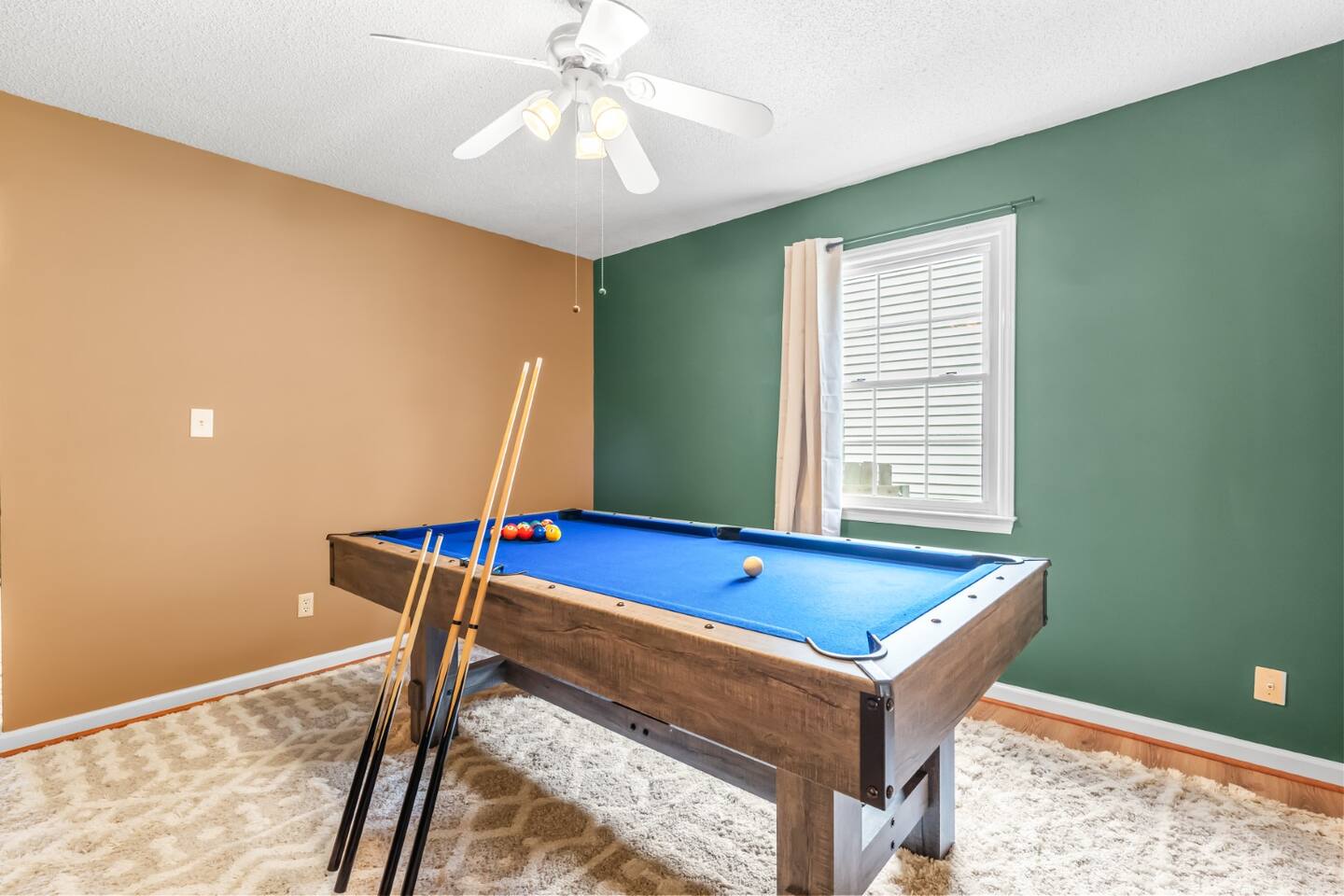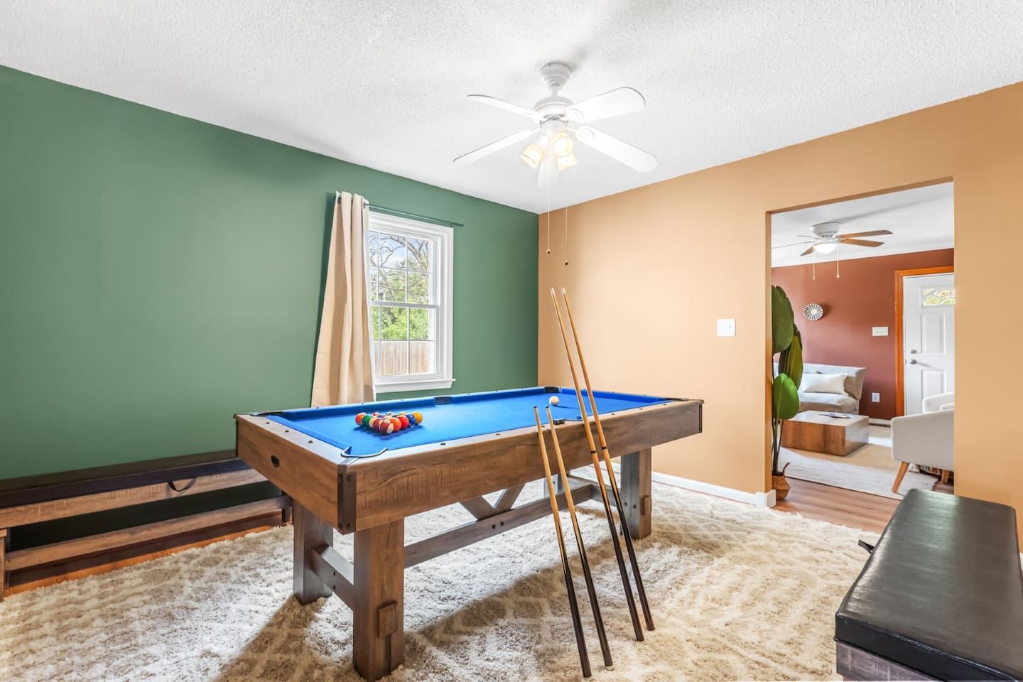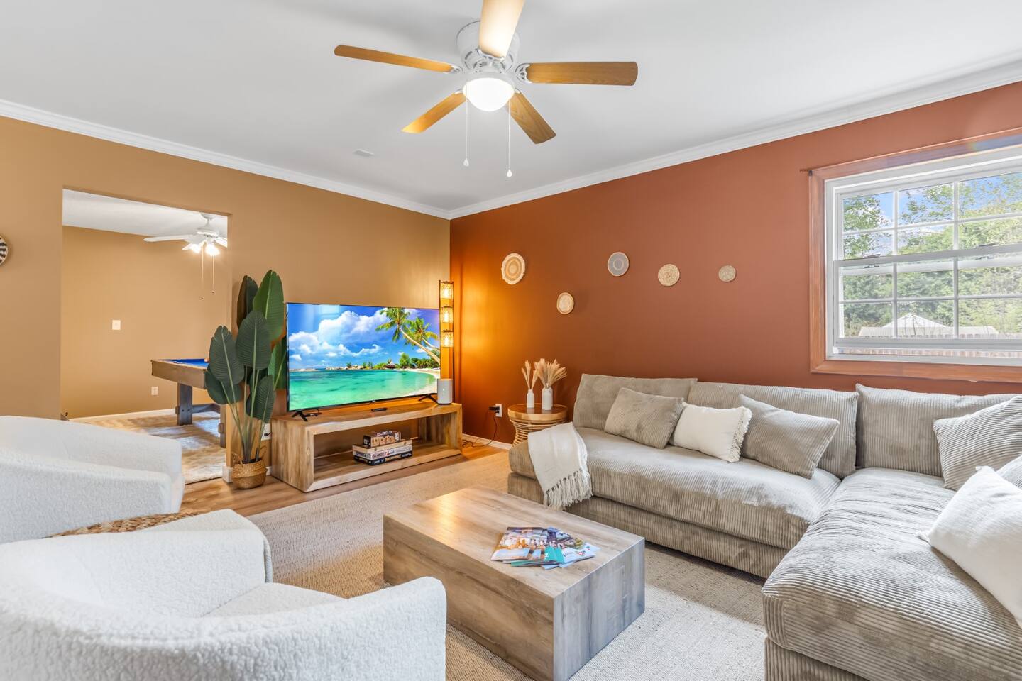 ✦ Entrance Room ✦ ↪ Day bed ↪ Coffee Stand ↪ Lounge chair ↪ Bohemian interior ↪ Wooden installation center art piece ↪ Bohemian light fixtures ↪ Room darkening curtains ↪ Shoe rack ↪ Large white fluffy rug ↪ First area you will see when you enter the house ✦ Game Room ✦ ↪ Billiard Table (short sticks) ↪ Game room benches ↪ Room darkening curtains ↪ Large white fluffy rug ✦ Living Room: 2 ✦ ↪ Corduroy L shaped couch ↪ Solid wooden rectangular coffee table ↪ 2 white boucle armchairs ↪ Ratan table ↪ 65 inch TV ↪ Modern bohemian interior and décor ↪ Open floor plan concept with the kitchen ↪ Large beige string rug ↪ Room darkening curtains ↪ Assortment of board games ✦ Dining Room ✦ ↪ 8 seats at a long wooden table ↪ Bohemian light fixtures ↪ Hanging swing shelving ↪ Room darkening curtains ↪ Steps away from the living room ↪ Beautiful table setup ✦ Kitchen ✦ ↪ Fully equipped and spacious ↪ Ample counter spaces ↪ Pantry with Fridge ↪ Keurig and French press ↪ Window ↪ Modern kitchen appliances ↪ Kitchen island with bar seating for 3 ↪ Steps away from the living room ✦ Bedrooms ✦ ↪ 4 bedrooms ↪ Master bedroom 55 inch TV ↪ Master bedroom walk in closet ↪ 1 King bed, 2 queen beds, and 2 twin beds ↪ Room darkening curtains ↪ Bohemian light fixtures ↪ Modern bohemian interior ↪ Master’s bedroom has a suite bathroom ✦ Bathrooms ✦ ↪ 2 bathrooms ↪ Bathtub and walk-in showers ↪ Jacuzzi jets in bathroom tub 1 ↪ Hygiene essentials ↪ Towels provided ✦ Outdoor Area ✦ ↪ Large front yard/driveway ↪ Yard/driveway lighting ↪ Porch with outdoor seating/string lighting ↪ Large back yard ↪ Back yard lighting ↪ Ratan seating/lounge area and umbrella with lighting ↪ Grill ↪ Corn Hole game setup