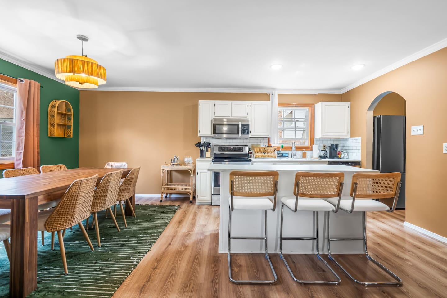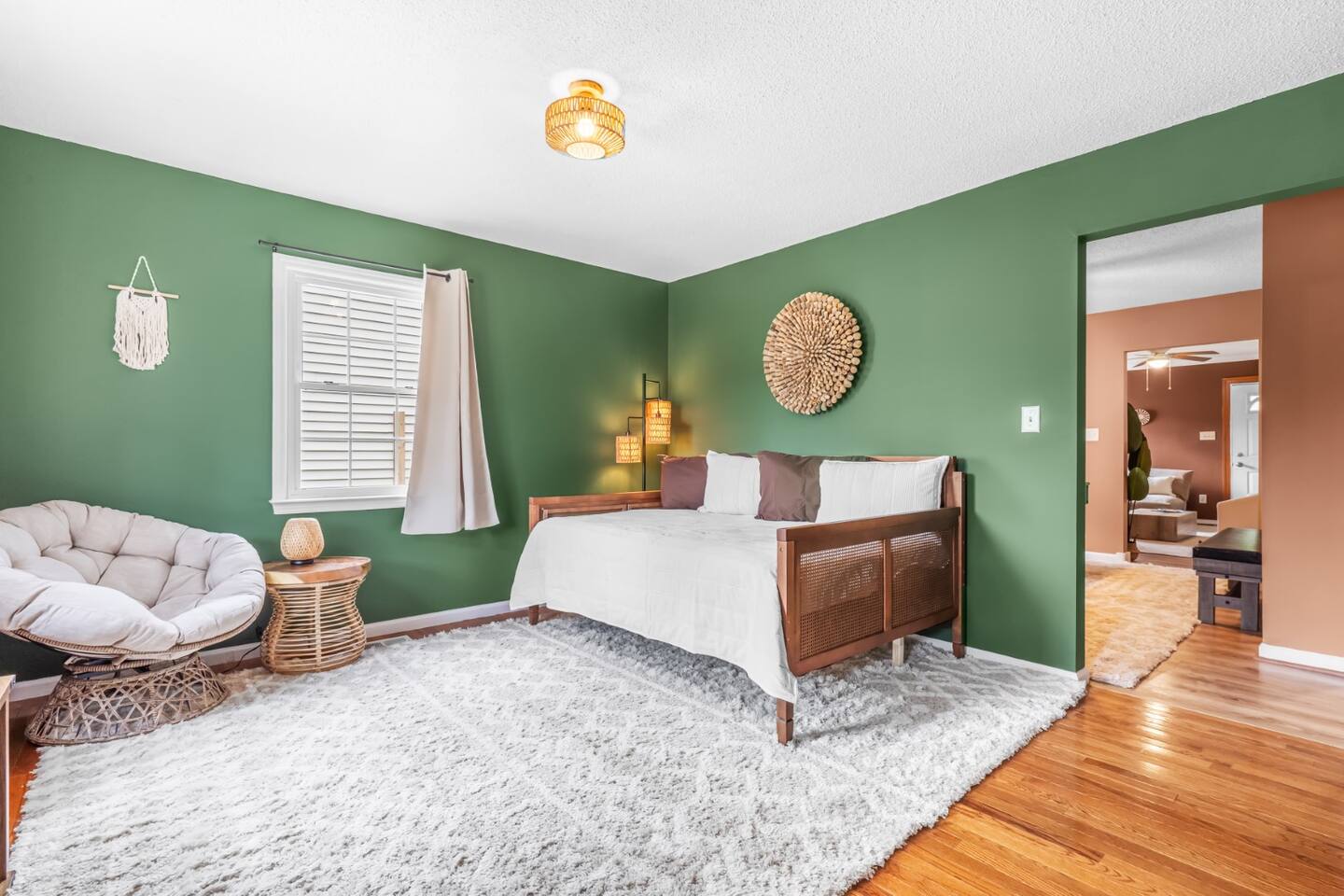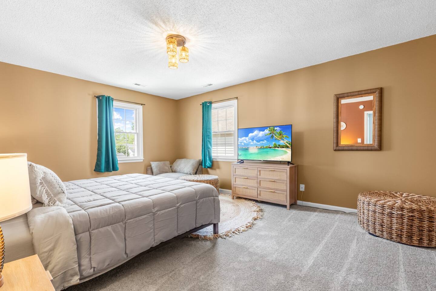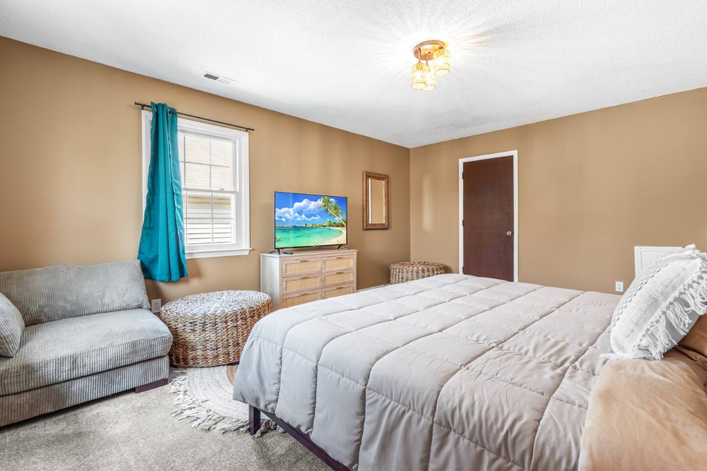 ✦ Entrance Room ✦ ↪ Day bed ↪ Coffee Stand ↪ Lounge chair ↪ Bohemian interior ↪ Wooden installation center art piece ↪ Bohemian light fixtures ↪ Room darkening curtains ↪ Shoe rack ↪ Large white fluffy rug ↪ First area you will see when you enter the house ✦ Game Room ✦ ↪ Billiard Table (short sticks) ↪ Game room benches ↪ Room darkening curtains ↪ Large white fluffy rug ✦ Living Room: 2 ✦ ↪ Corduroy L shaped couch ↪ Solid wooden rectangular coffee table ↪ 2 white boucle armchairs ↪ Ratan table ↪ 65 inch TV ↪ Modern bohemian interior and décor ↪ Open floor plan concept with the kitchen ↪ Large beige string rug ↪ Room darkening curtains ↪ Assortment of board games ✦ Dining Room ✦ ↪ 8 seats at a long wooden table ↪ Bohemian light fixtures ↪ Hanging swing shelving ↪ Room darkening curtains ↪ Steps away from the living room ↪ Beautiful table setup ✦ Kitchen ✦ ↪ Fully equipped and spacious ↪ Ample counter spaces ↪ Pantry with Fridge ↪ Keurig and French press ↪ Window ↪ Modern kitchen appliances ↪ Kitchen island with bar seating for 3 ↪ Steps away from the living room ✦ Bedrooms ✦ ↪ 4 bedrooms ↪ Master bedroom 55 inch TV ↪ Master bedroom walk in closet ↪ 1 King bed, 2 queen beds, and 2 twin beds ↪ Room darkening curtains ↪ Bohemian light fixtures ↪ Modern bohemian interior ↪ Master’s bedroom has a suite bathroom ✦ Bathrooms ✦ ↪ 2 bathrooms ↪ Bathtub and walk-in showers ↪ Jacuzzi jets in bathroom tub 1 ↪ Hygiene essentials ↪ Towels provided ✦ Outdoor Area ✦ ↪ Large front yard/driveway ↪ Yard/driveway lighting ↪ Porch with outdoor seating/string lighting ↪ Large back yard ↪ Back yard lighting ↪ Ratan seating/lounge area and umbrella with lighting ↪ Grill ↪ Corn Hole game setup