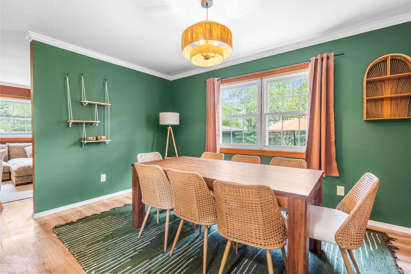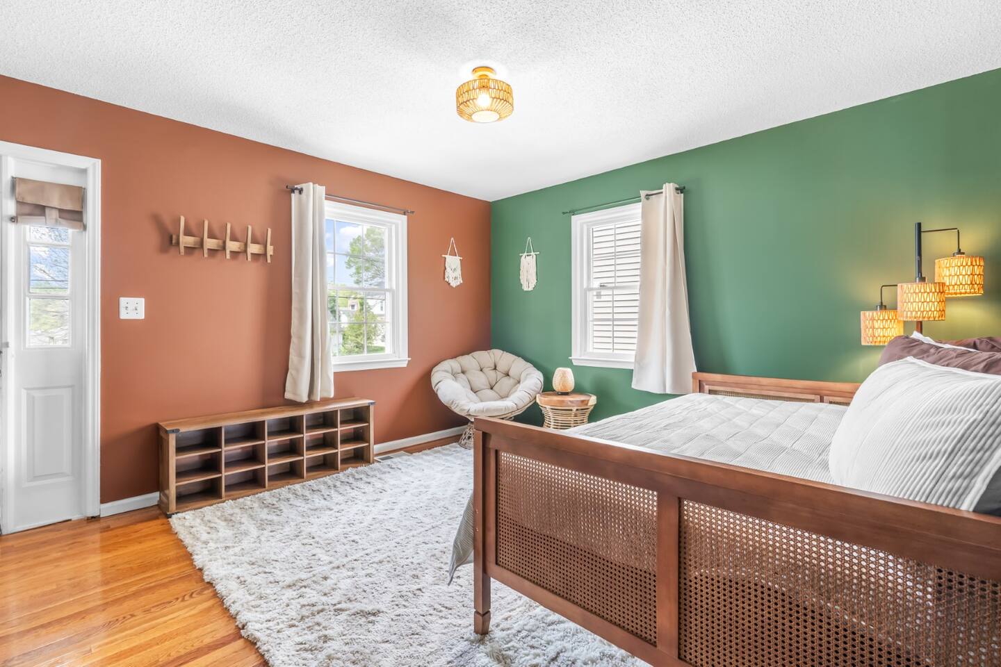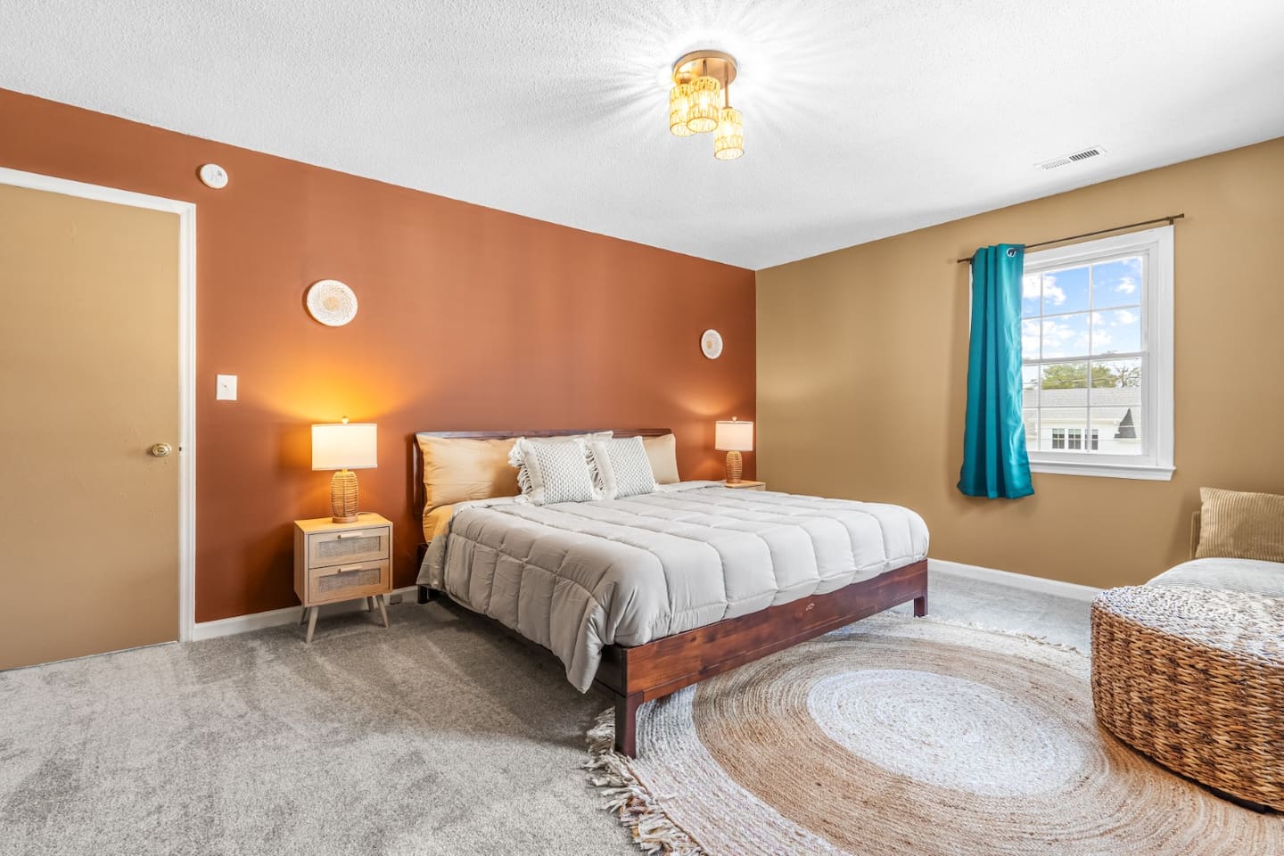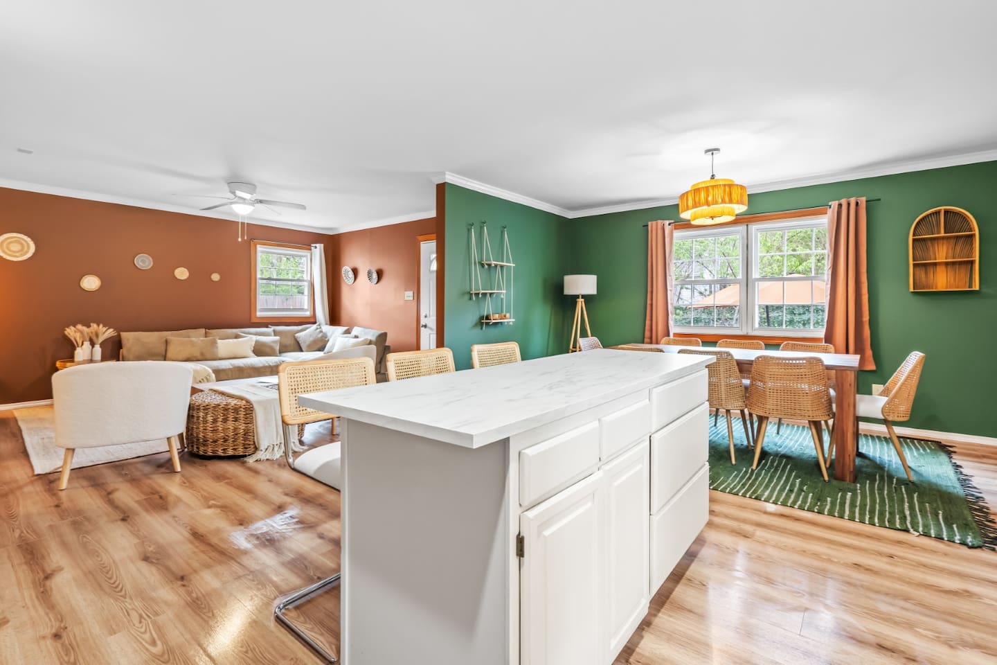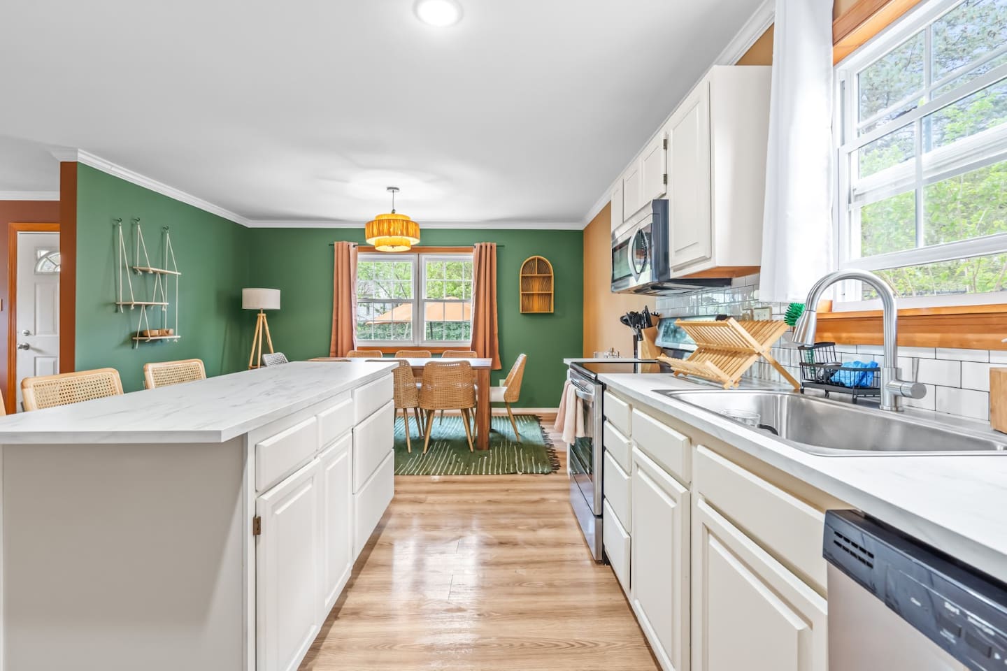 ✦ Entrance Room ✦ ↪ Day bed ↪ Coffee Stand ↪ Lounge chair ↪ Bohemian interior ↪ Wooden installation center art piece ↪ Bohemian light fixtures ↪ Room darkening curtains ↪ Shoe rack ↪ Large white fluffy rug ↪ First area you will see when you enter the house ✦ Game Room ✦ ↪ Billiard Table (short sticks) ↪ Game room benches ↪ Room darkening curtains ↪ Large white fluffy rug ✦ Living Room: 2 ✦ ↪ Corduroy L shaped couch ↪ Solid wooden rectangular coffee table ↪ 2 white boucle armchairs ↪ Ratan table ↪ 65 inch TV ↪ Modern bohemian interior and décor ↪ Open floor plan concept with the kitchen ↪ Large beige string rug ↪ Room darkening curtains ↪ Assortment of board games ✦ Dining Room ✦ ↪ 8 seats at a long wooden table ↪ Bohemian light fixtures ↪ Hanging swing shelving ↪ Room darkening curtains ↪ Steps away from the living room ↪ Beautiful table setup ✦ Kitchen ✦ ↪ Fully equipped and spacious ↪ Ample counter spaces ↪ Pantry with Fridge ↪ Keurig and French press ↪ Window ↪ Modern kitchen appliances ↪ Kitchen island with bar seating for 3 ↪ Steps away from the living room ✦ Bedrooms ✦ ↪ 4 bedrooms ↪ Master bedroom 55 inch TV ↪ Master bedroom walk in closet ↪ 1 King bed, 2 queen beds, and 2 twin beds ↪ Room darkening curtains ↪ Bohemian light fixtures ↪ Modern bohemian interior ↪ Master’s bedroom has a suite bathroom ✦ Bathrooms ✦ ↪ 2 bathrooms ↪ Bathtub and walk-in showers ↪ Jacuzzi jets in bathroom tub 1 ↪ Hygiene essentials ↪ Towels provided ✦ Outdoor Area ✦ ↪ Large front yard/driveway ↪ Yard/driveway lighting ↪ Porch with outdoor seating/string lighting ↪ Large back yard ↪ Back yard lighting ↪ Ratan seating/lounge area and umbrella with lighting ↪ Grill ↪ Corn Hole game setup