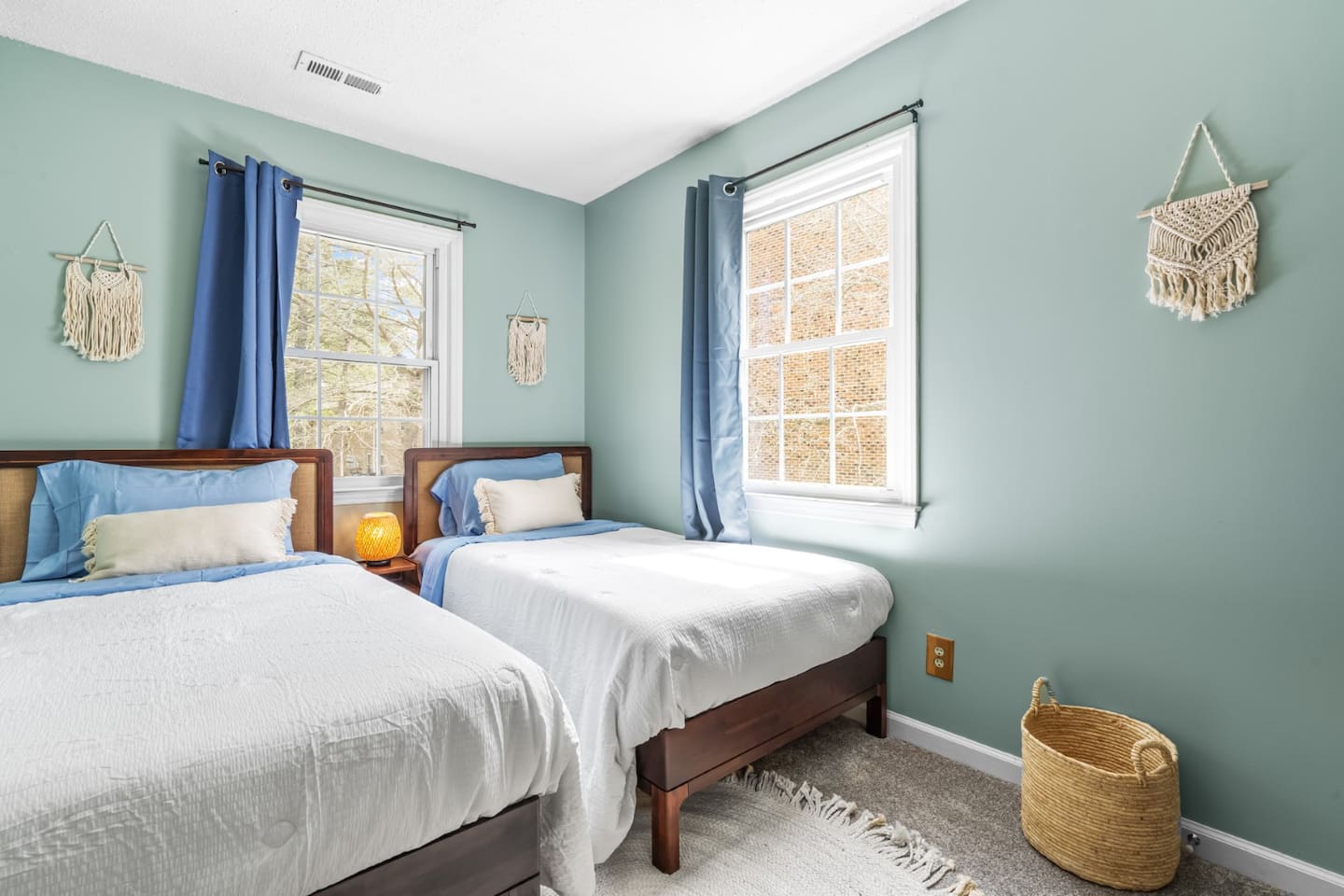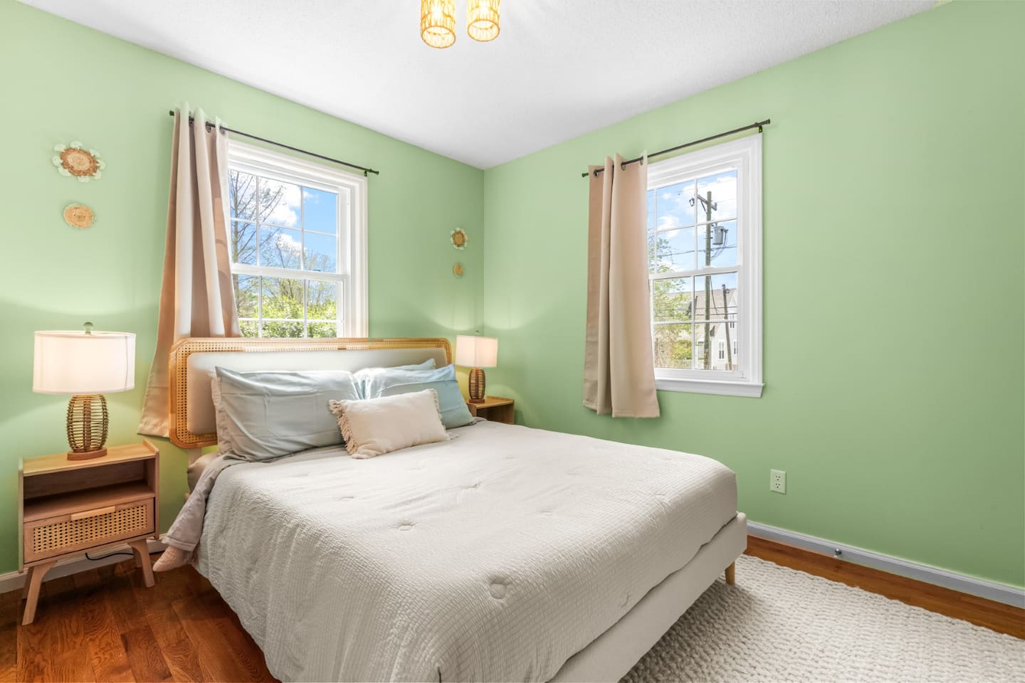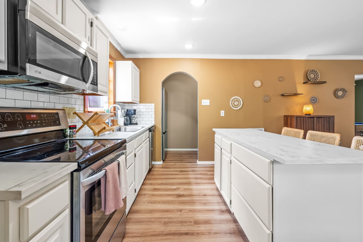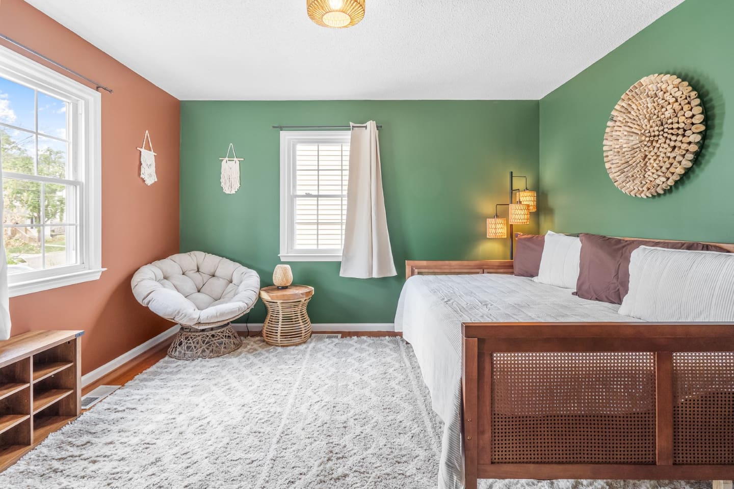 ✦ Entrance Room ✦ ↪ Day bed ↪ Coffee Stand ↪ Lounge chair ↪ Bohemian interior ↪ Wooden installation center art piece ↪ Bohemian light fixtures ↪ Room darkening curtains ↪ Shoe rack ↪ Large white fluffy rug ↪ First area you will see when you enter the house ✦ Game Room ✦ ↪ Billiard Table (short sticks) ↪ Game room benches ↪ Room darkening curtains ↪ Large white fluffy rug ✦ Living Room: 2 ✦ ↪ Corduroy L shaped couch ↪ Solid wooden rectangular coffee table ↪ 2 white boucle armchairs ↪ Ratan table ↪ 65 inch TV ↪ Modern bohemian interior and décor ↪ Open floor plan concept with the kitchen ↪ Large beige string rug ↪ Room darkening curtains ↪ Assortment of board games ✦ Dining Room ✦ ↪ 8 seats at a long wooden table ↪ Bohemian light fixtures ↪ Hanging swing shelving ↪ Room darkening curtains ↪ Steps away from the living room ↪ Beautiful table setup ✦ Kitchen ✦ ↪ Fully equipped and spacious ↪ Ample counter spaces ↪ Pantry with Fridge ↪ Keurig and French press ↪ Window ↪ Modern kitchen appliances ↪ Kitchen island with bar seating for 3 ↪ Steps away from the living room ✦ Bedrooms ✦ ↪ 4 bedrooms ↪ Master bedroom 55 inch TV ↪ Master bedroom walk in closet ↪ 1 King bed, 2 queen beds, and 2 twin beds ↪ Room darkening curtains ↪ Bohemian light fixtures ↪ Modern bohemian interior ↪ Master’s bedroom has a suite bathroom ✦ Bathrooms ✦ ↪ 2 bathrooms ↪ Bathtub and walk-in showers ↪ Jacuzzi jets in bathroom tub 1 ↪ Hygiene essentials ↪ Towels provided ✦ Outdoor Area ✦ ↪ Large front yard/driveway ↪ Yard/driveway lighting ↪ Porch with outdoor seating/string lighting ↪ Large back yard ↪ Back yard lighting ↪ Ratan seating/lounge area and umbrella with lighting ↪ Grill ↪ Corn Hole game setup
