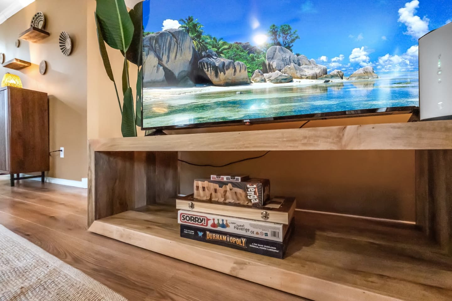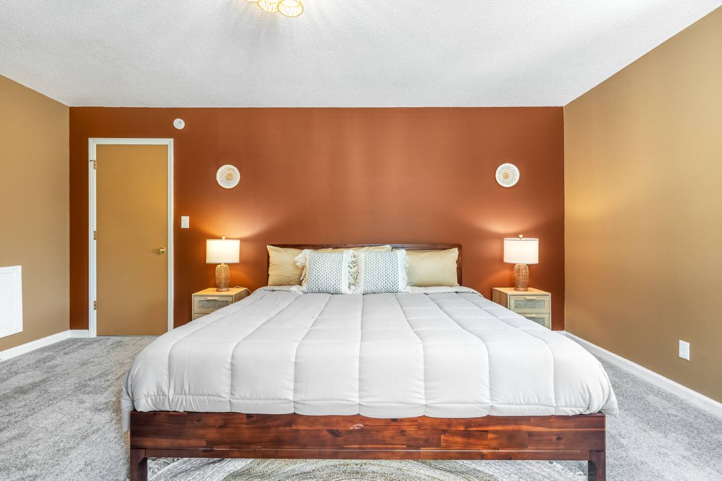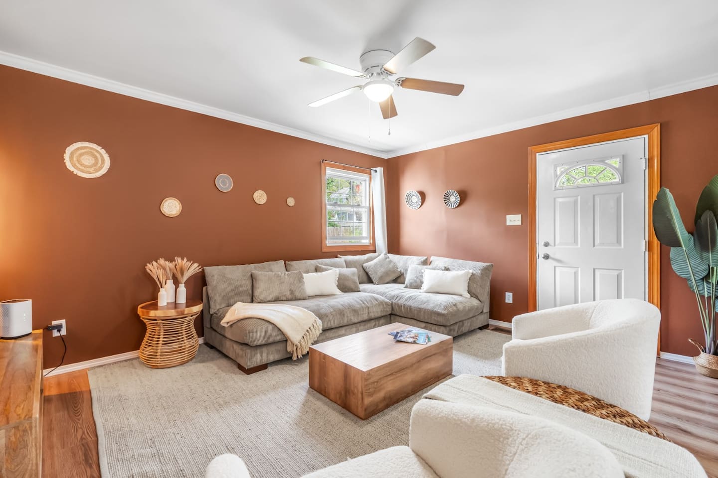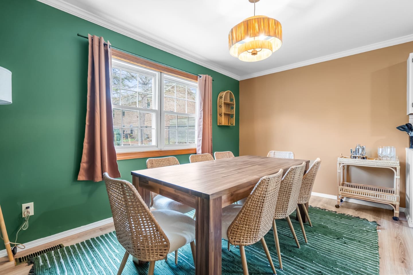 ✦ Entrance Room ✦ ↪ Day bed ↪ Coffee Stand ↪ Lounge chair ↪ Bohemian interior ↪ Wooden installation center art piece ↪ Bohemian light fixtures ↪ Room darkening curtains ↪ Shoe rack ↪ Large white fluffy rug ↪ First area you will see when you enter the house ✦ Game Room ✦ ↪ Billiard Table (short sticks) ↪ Game room benches ↪ Room darkening curtains ↪ Large white fluffy rug ✦ Living Room: 2 ✦ ↪ Corduroy L shaped couch ↪ Solid wooden rectangular coffee table ↪ 2 white boucle armchairs ↪ Ratan table ↪ 65 inch TV ↪ Modern bohemian interior and décor ↪ Open floor plan concept with the kitchen ↪ Large beige string rug ↪ Room darkening curtains ↪ Assortment of board games ✦ Dining Room ✦ ↪ 8 seats at a long wooden table ↪ Bohemian light fixtures ↪ Hanging swing shelving ↪ Room darkening curtains ↪ Steps away from the living room ↪ Beautiful table setup ✦ Kitchen ✦ ↪ Fully equipped and spacious ↪ Ample counter spaces ↪ Pantry with Fridge ↪ Keurig and French press ↪ Window ↪ Modern kitchen appliances ↪ Kitchen island with bar seating for 3 ↪ Steps away from the living room ✦ Bedrooms ✦ ↪ 4 bedrooms ↪ Master bedroom 55 inch TV ↪ Master bedroom walk in closet ↪ 1 King bed, 2 queen beds, and 2 twin beds ↪ Room darkening curtains ↪ Bohemian light fixtures ↪ Modern bohemian interior ↪ Master’s bedroom has a suite bathroom ✦ Bathrooms ✦ ↪ 2 bathrooms ↪ Bathtub and walk-in showers ↪ Jacuzzi jets in bathroom tub 1 ↪ Hygiene essentials ↪ Towels provided ✦ Outdoor Area ✦ ↪ Large front yard/driveway ↪ Yard/driveway lighting ↪ Porch with outdoor seating/string lighting ↪ Large back yard ↪ Back yard lighting ↪ Ratan seating/lounge area and umbrella with lighting ↪ Grill ↪ Corn Hole game setup