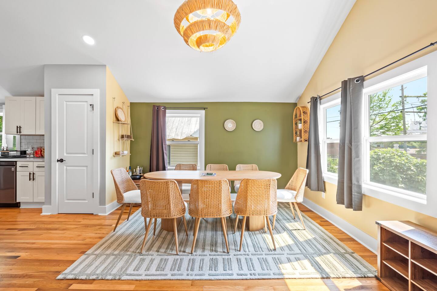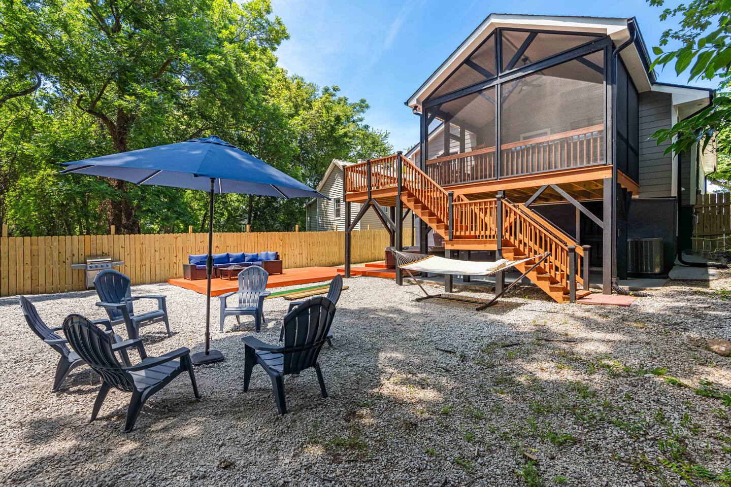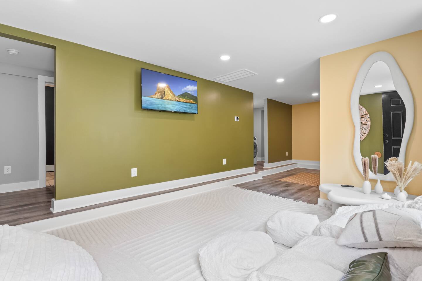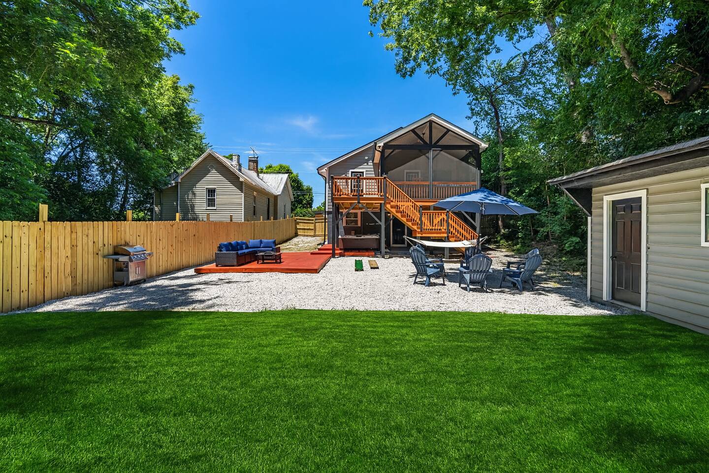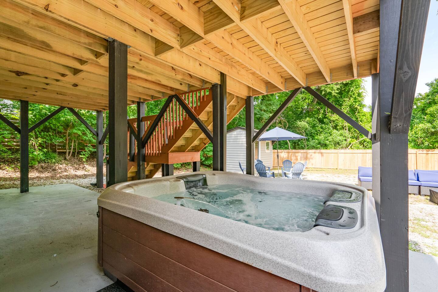 Newly renovated 5BR Boho Villa on a quiet, peaceful street just steps from downtown Raleigh. Soak in the private indoor hot tub, then relax on the spacious patio with a cozy fireplace, bar, and TV. The large backyard features a hammock chair, Adirondack chairs, couches, BBQ grill, plus fun games like darts, foosball, mini golf, and board games—perfect for family and friends. Inside, enjoy stylish new finishes, a fully equipped kitchen, quality furniture, and 4 smart TVs.