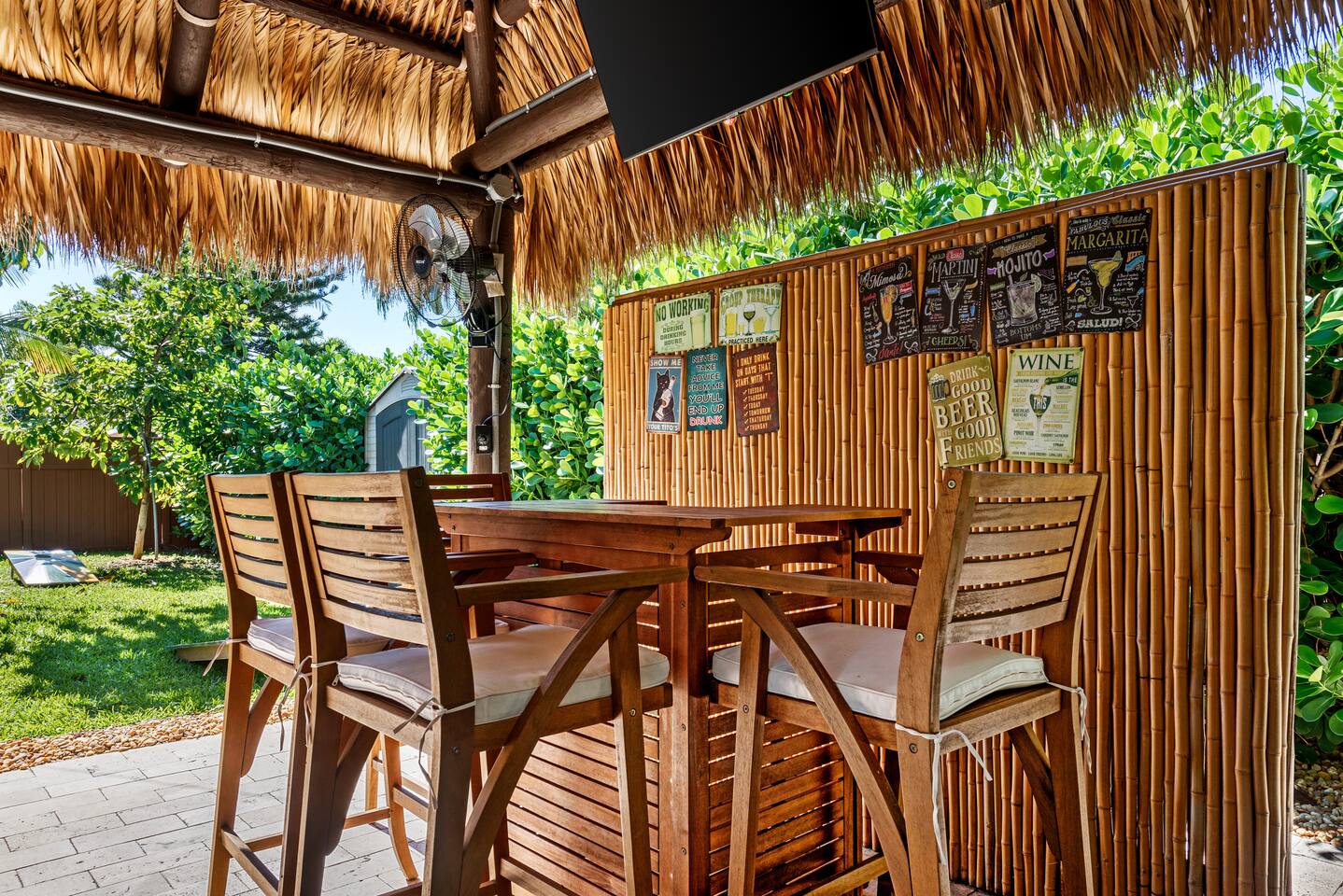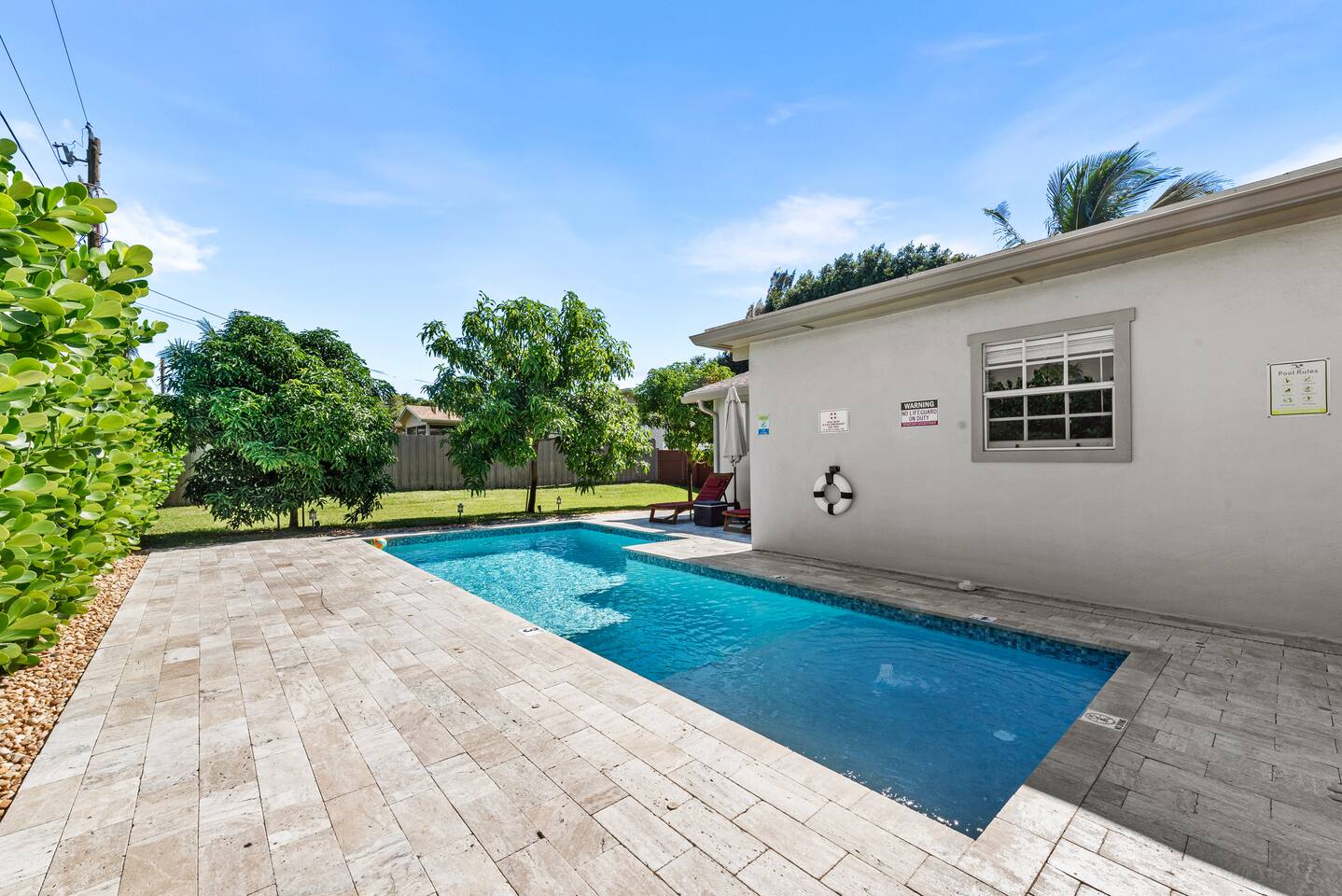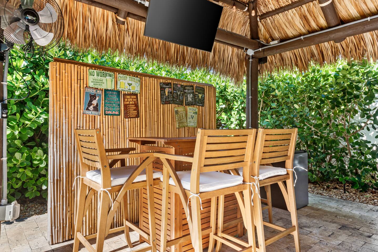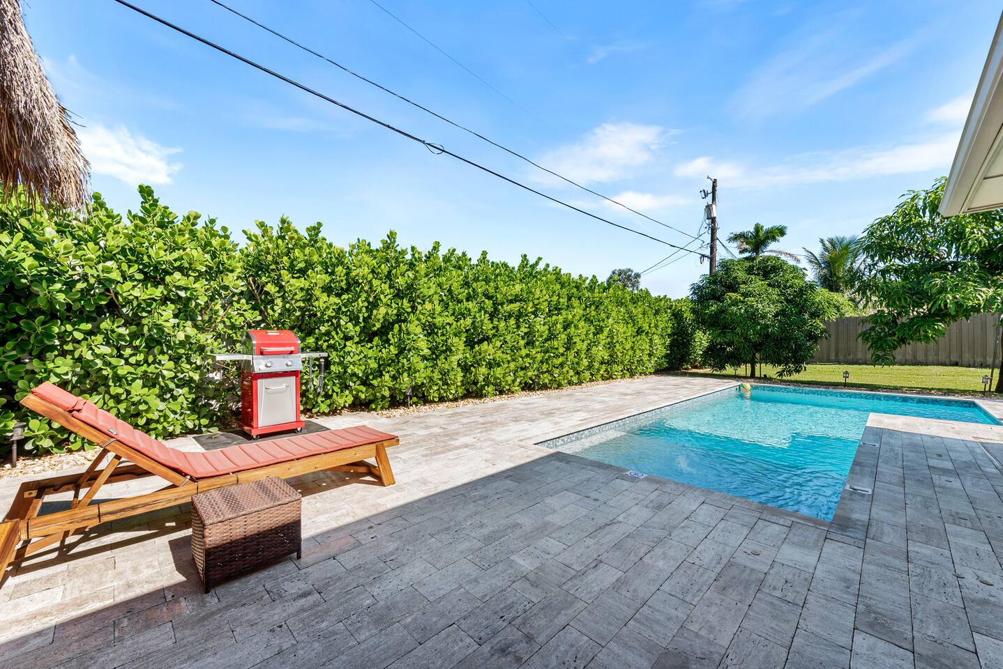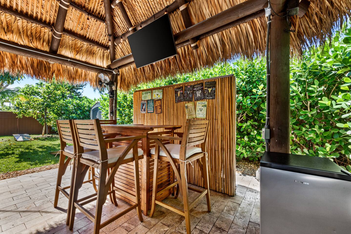 The beautifully landscaped backyard features a heated saltwater pool, lush coconut and mango trees, and a tiki hut designed for ultimate relaxation and entertainment. The tiki hut is equipped with lounge seating, a dining area, a bar with a mini-fridge, ceiling fans, a TV, and a grill for memorable outdoor gatherings. Lounge by the pool on sun loungers or enjoy fun outdoor games like cornhole. Inside, the home offers modern comforts, including super-fast WiFi for streaming or remote work, a fully equipped kitchen, board games for family fun, TVs in every room, and spacious sleeping accommodations: 3 king beds, a bedroom with 2 twin beds, and a crib for infants.