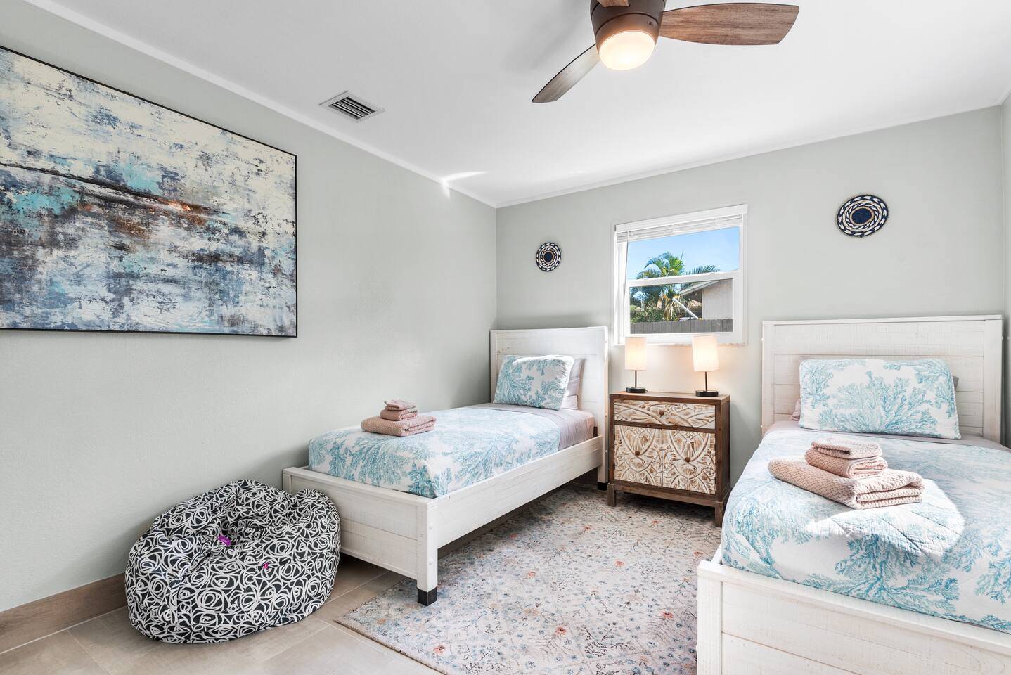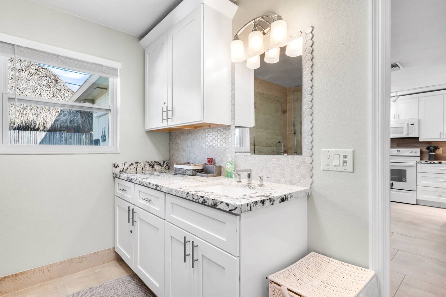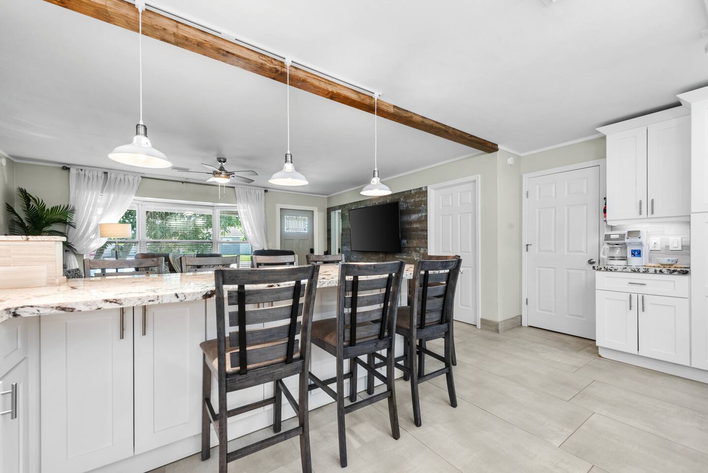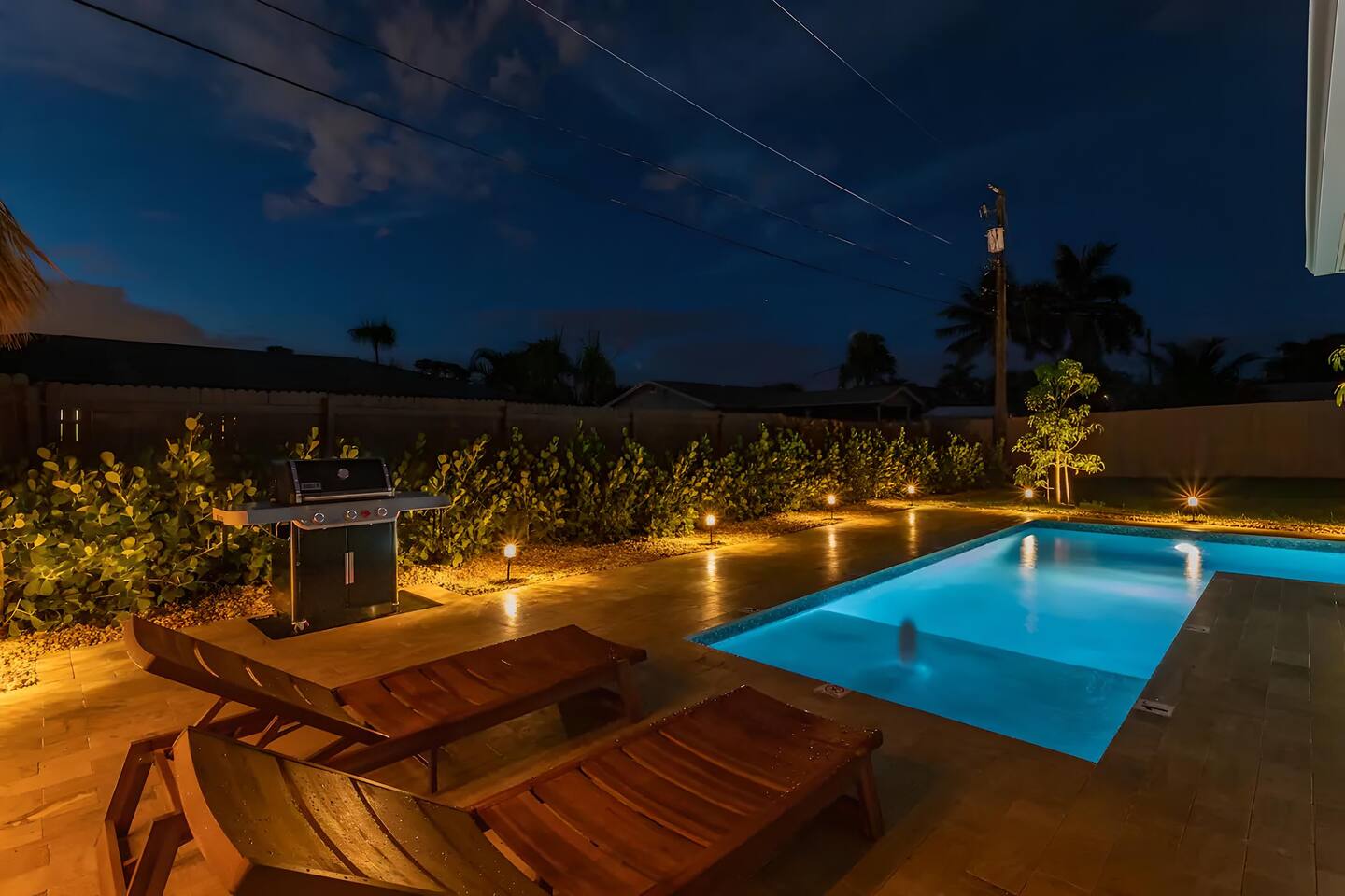 The beautifully landscaped backyard features a heated saltwater pool, lush coconut and mango trees, and a tiki hut designed for ultimate relaxation and entertainment. The tiki hut is equipped with lounge seating, a dining area, a bar with a mini-fridge, ceiling fans, a TV, and a grill for memorable outdoor gatherings. Lounge by the pool on sun loungers or enjoy fun outdoor games like cornhole. Inside, the home offers modern comforts, including super-fast WiFi for streaming or remote work, a fully equipped kitchen, board games for family fun, TVs in every room, and spacious sleeping accommodations: 3 king beds, a bedroom with 2 twin beds, and a crib for infants.