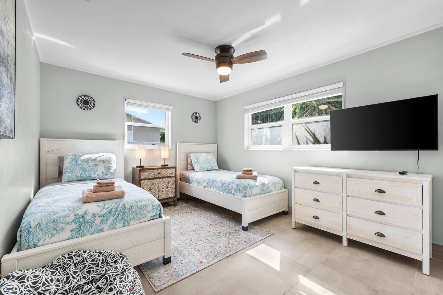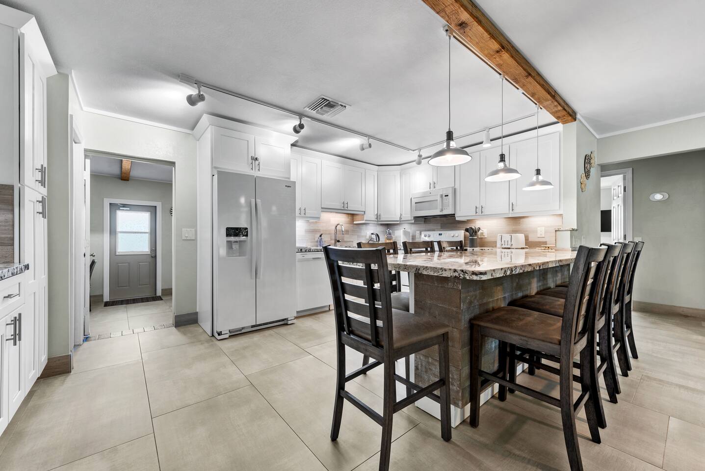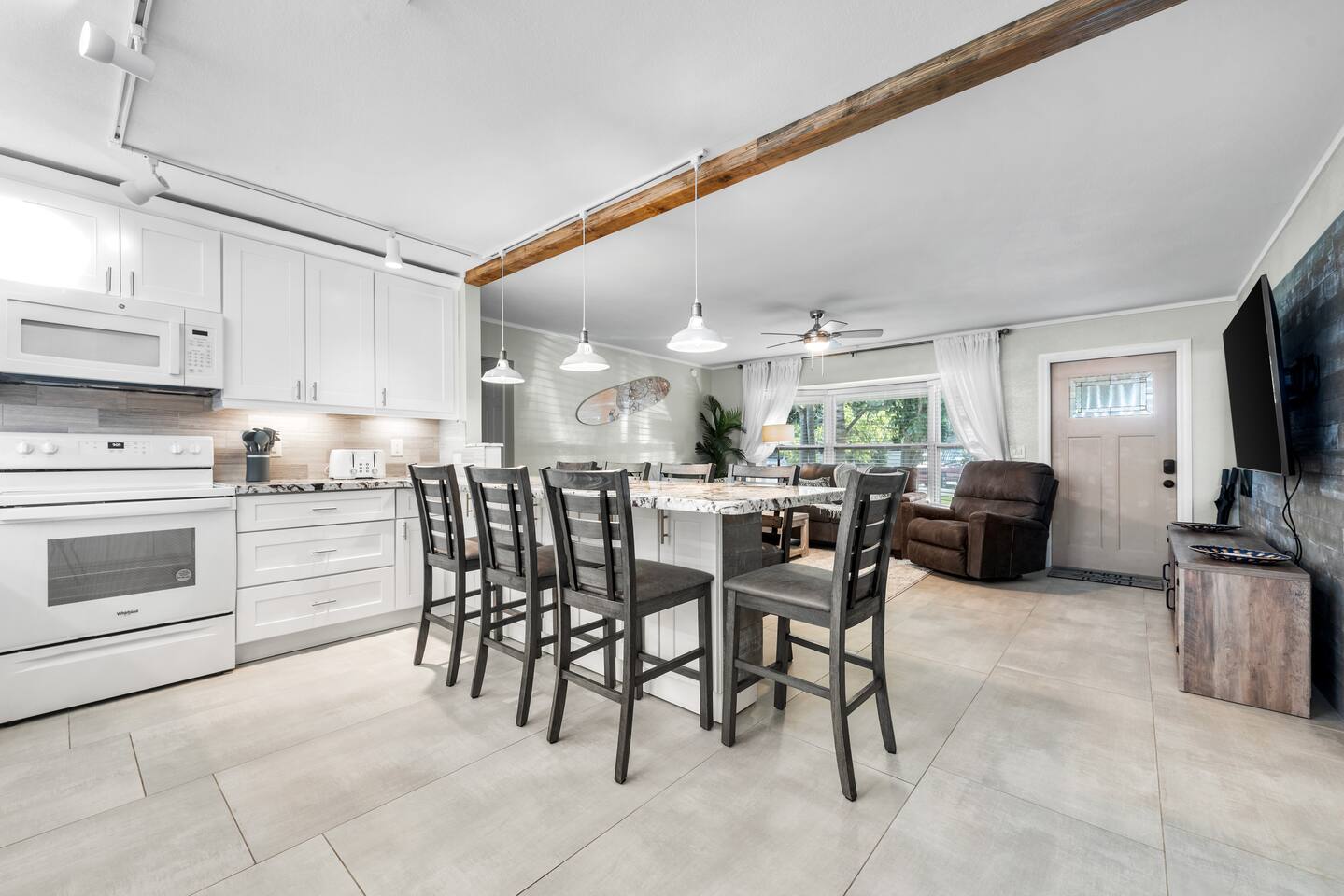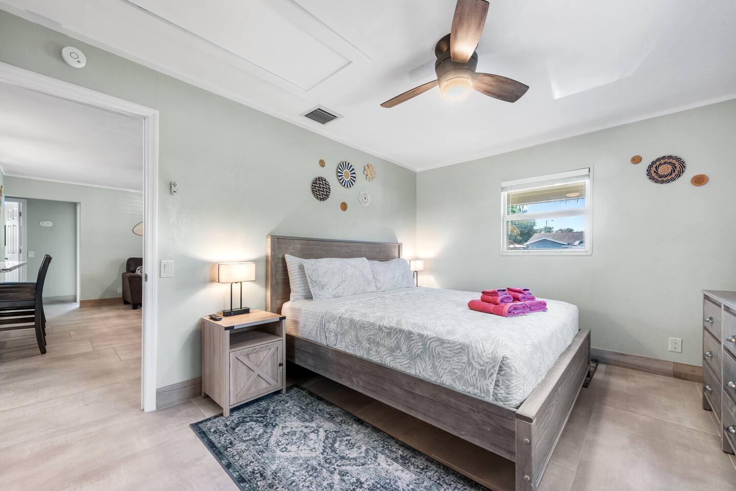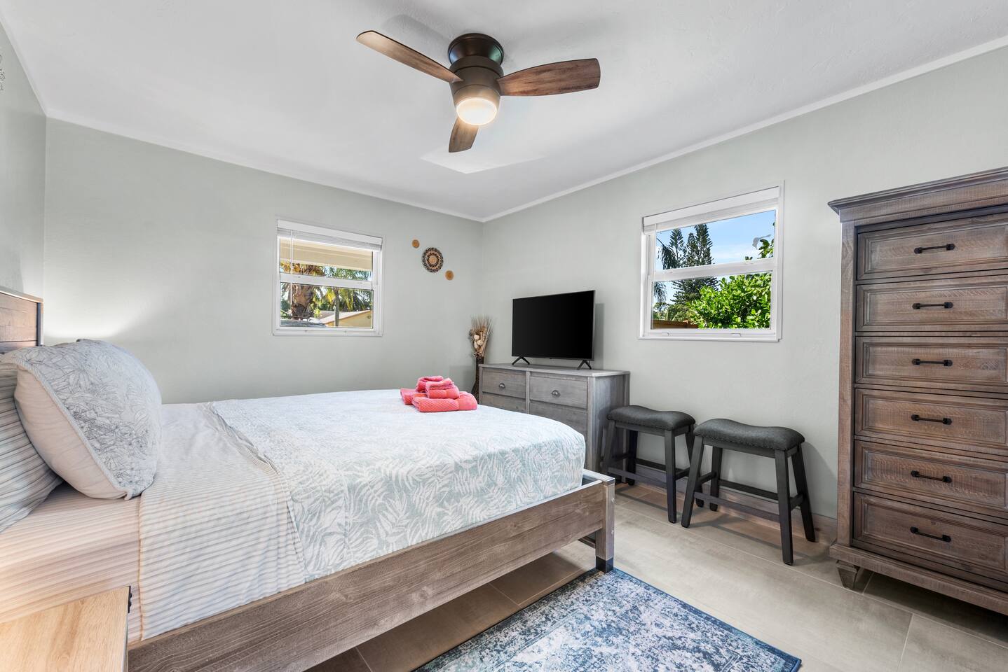 The beautifully landscaped backyard features a heated saltwater pool, lush coconut and mango trees, and a tiki hut designed for ultimate relaxation and entertainment. The tiki hut is equipped with lounge seating, a dining area, a bar with a mini-fridge, ceiling fans, a TV, and a grill for memorable outdoor gatherings. Lounge by the pool on sun loungers or enjoy fun outdoor games like cornhole. Inside, the home offers modern comforts, including super-fast WiFi for streaming or remote work, a fully equipped kitchen, board games for family fun, TVs in every room, and spacious sleeping accommodations: 3 king beds, a bedroom with 2 twin beds, and a crib for infants.
