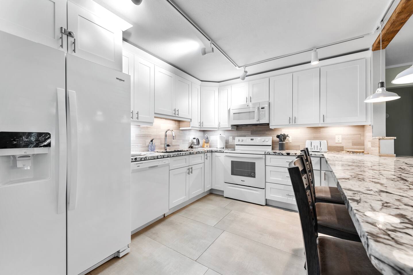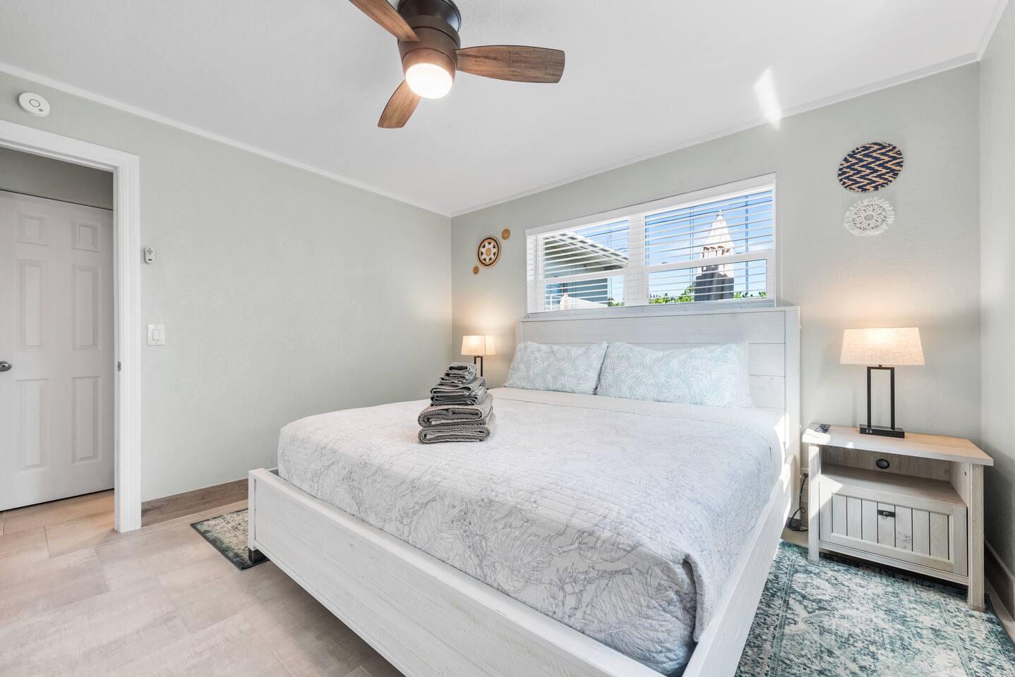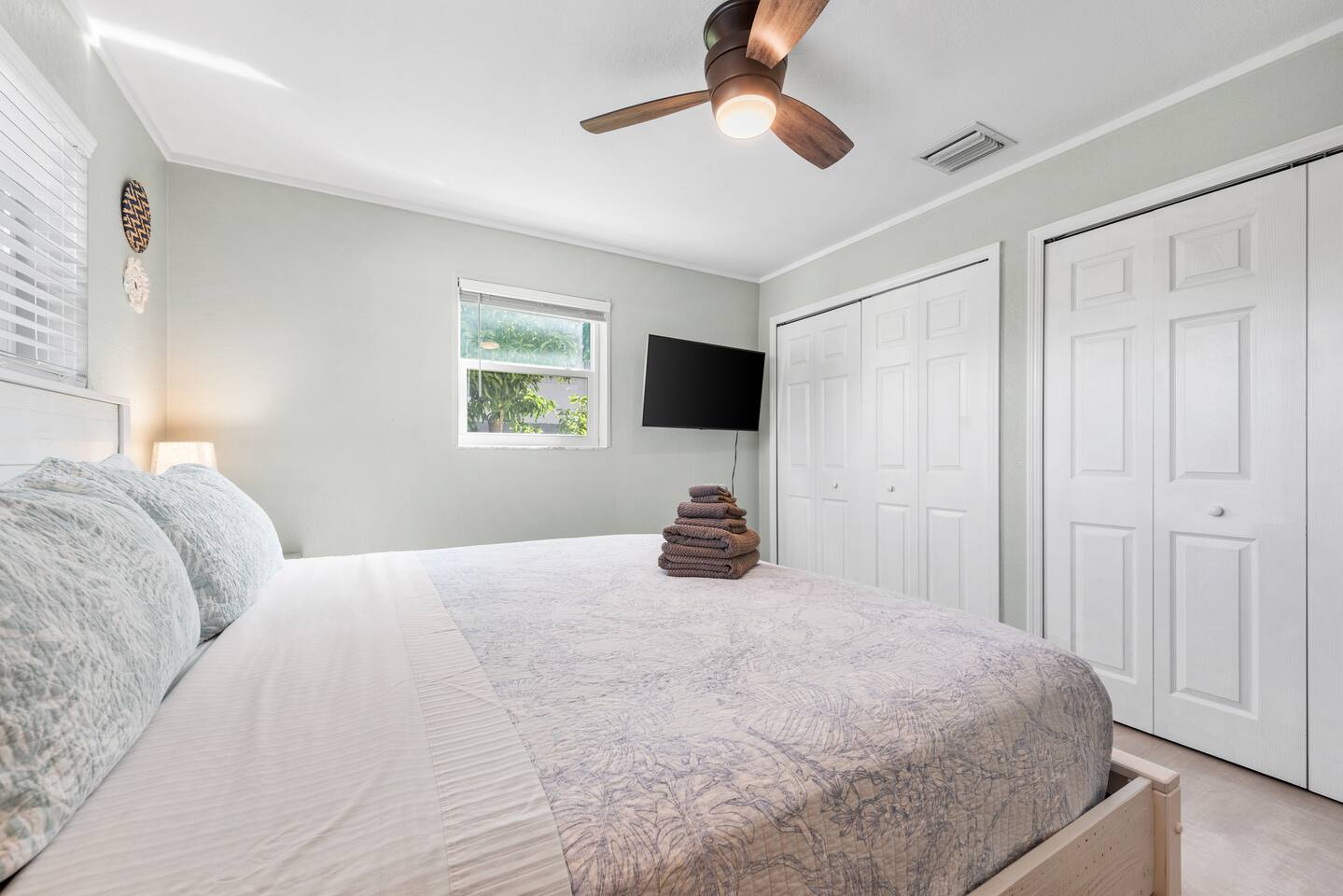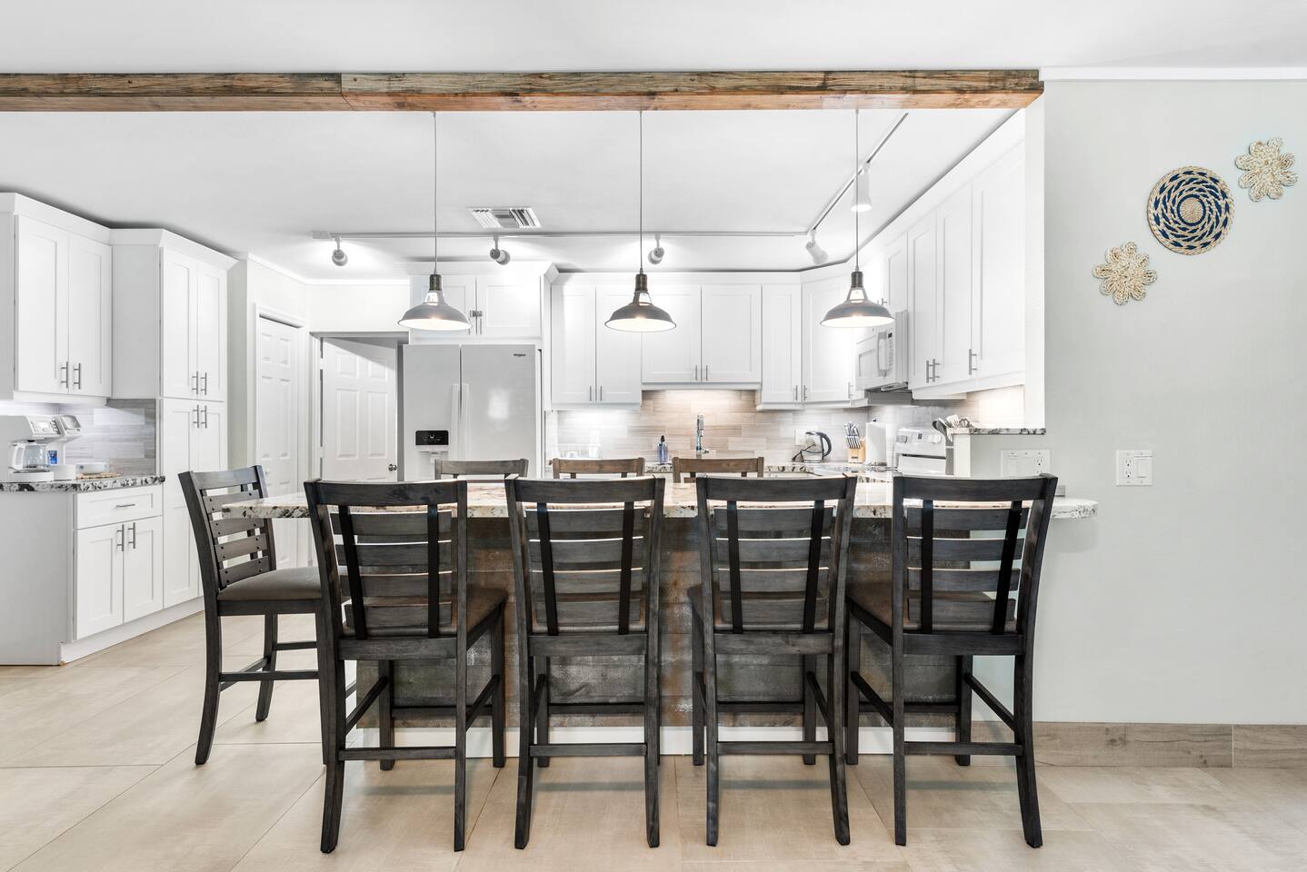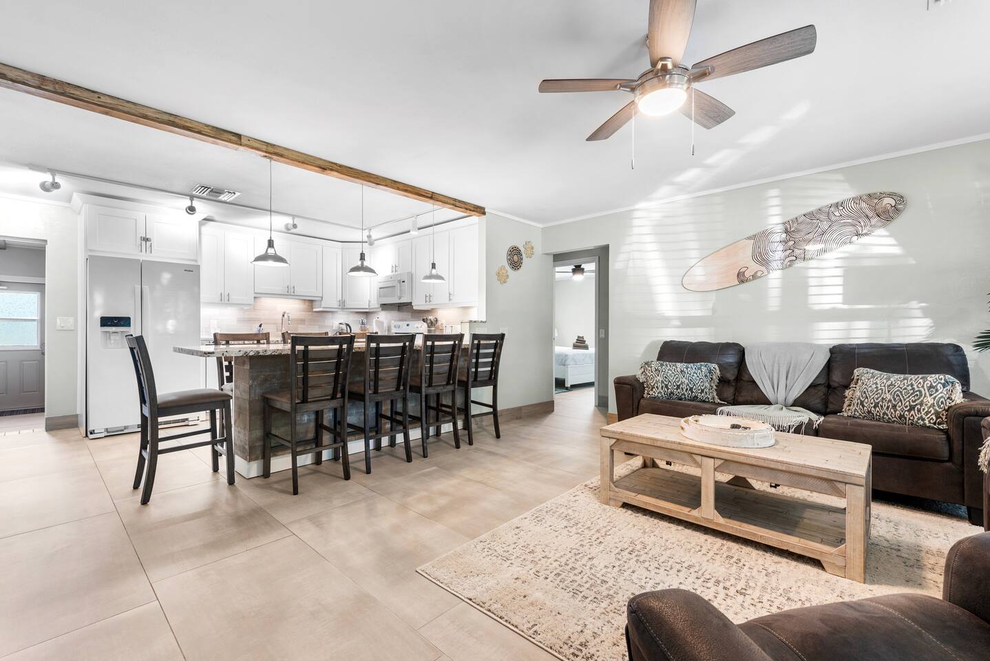 The beautifully landscaped backyard features a heated saltwater pool, lush coconut and mango trees, and a tiki hut designed for ultimate relaxation and entertainment. The tiki hut is equipped with lounge seating, a dining area, a bar with a mini-fridge, ceiling fans, a TV, and a grill for memorable outdoor gatherings. Lounge by the pool on sun loungers or enjoy fun outdoor games like cornhole. Inside, the home offers modern comforts, including super-fast WiFi for streaming or remote work, a fully equipped kitchen, board games for family fun, TVs in every room, and spacious sleeping accommodations: 3 king beds, a bedroom with 2 twin beds, and a crib for infants.