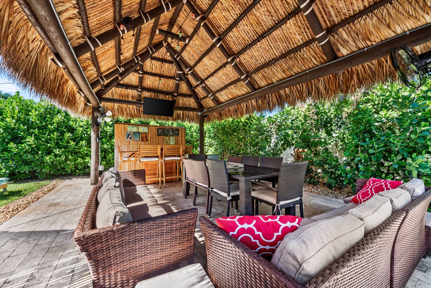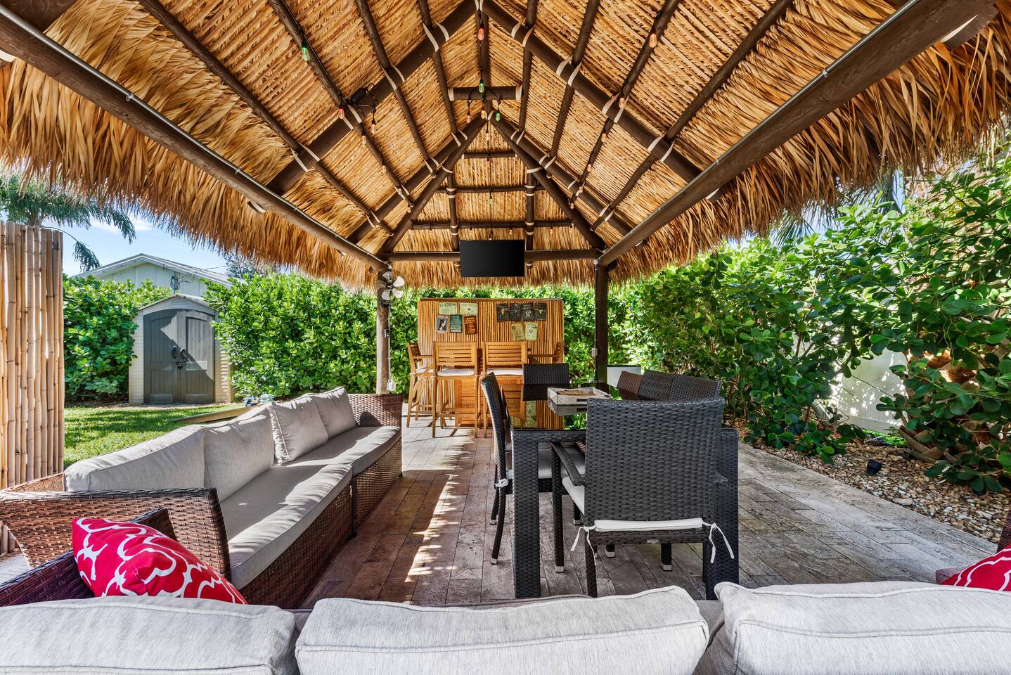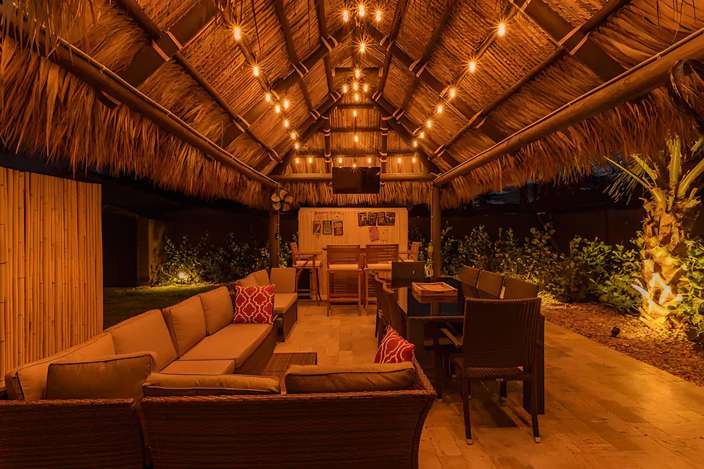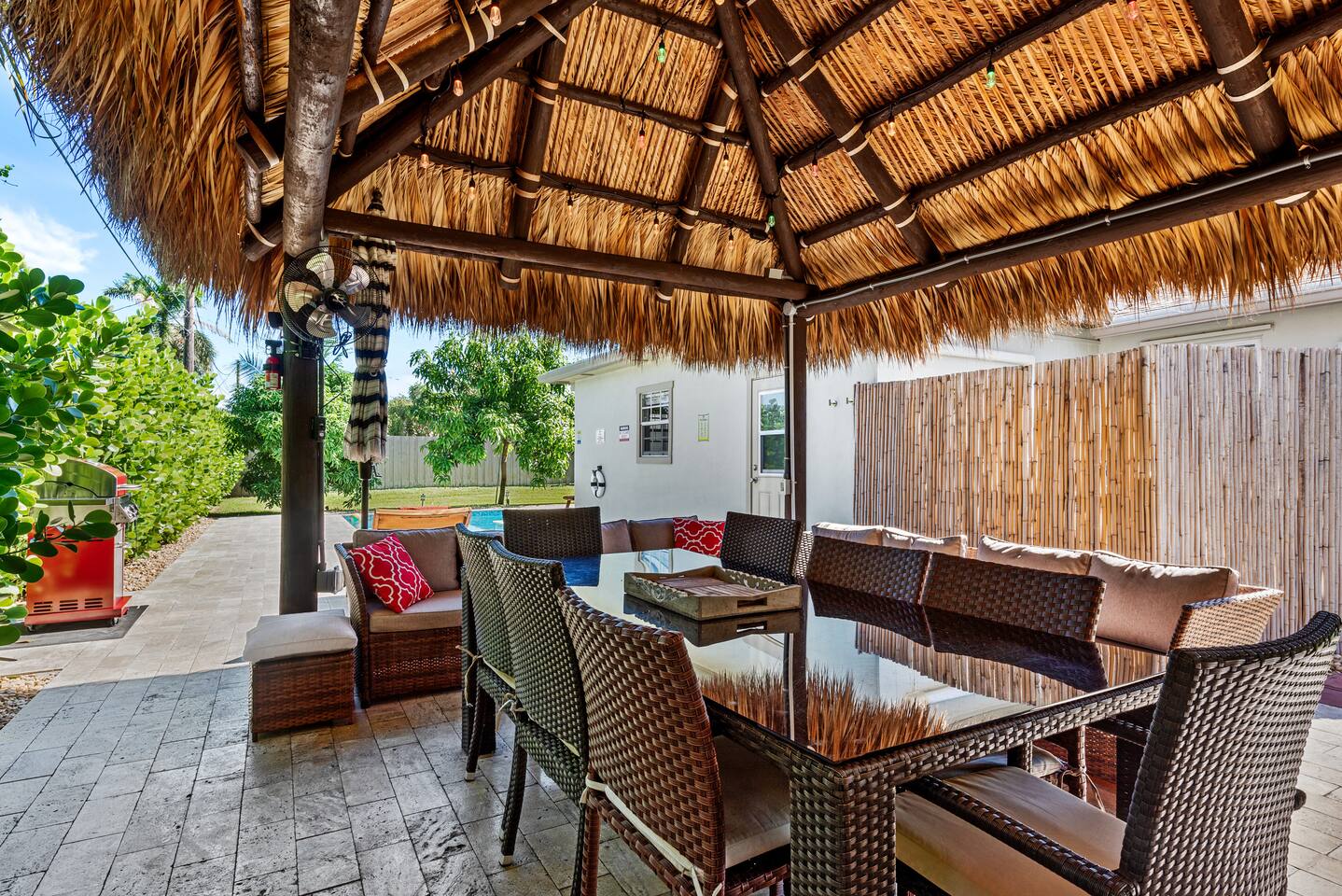 This tropical 4-bedroom family retreat combines a bohemian vibe with modern comfort. Enjoy a heated saltwater pool and a tiki hut equipped with lounge seating, dining, a bar with a mini-fridge, ceiling fans, a grill, and a TV—perfect for outdoor relaxation or entertainment. Inside, find TVs in every room, spacious accommodations, a full kitchen, and games. Surrounded by coconut and mango trees, this serene escape is just 10 minutes from the beach and 15 minutes from Palm Beach Airport.