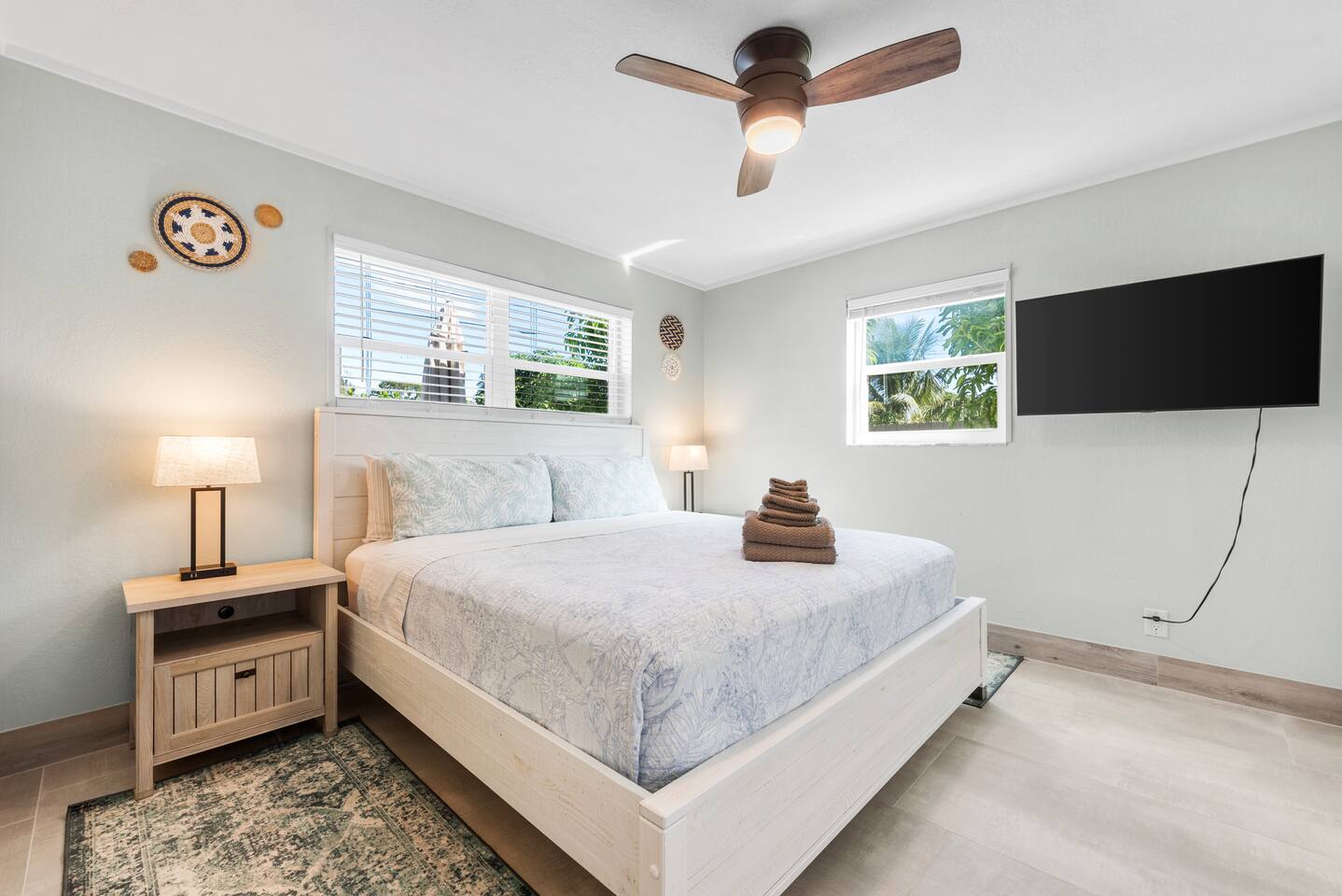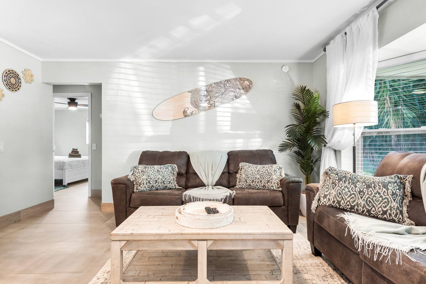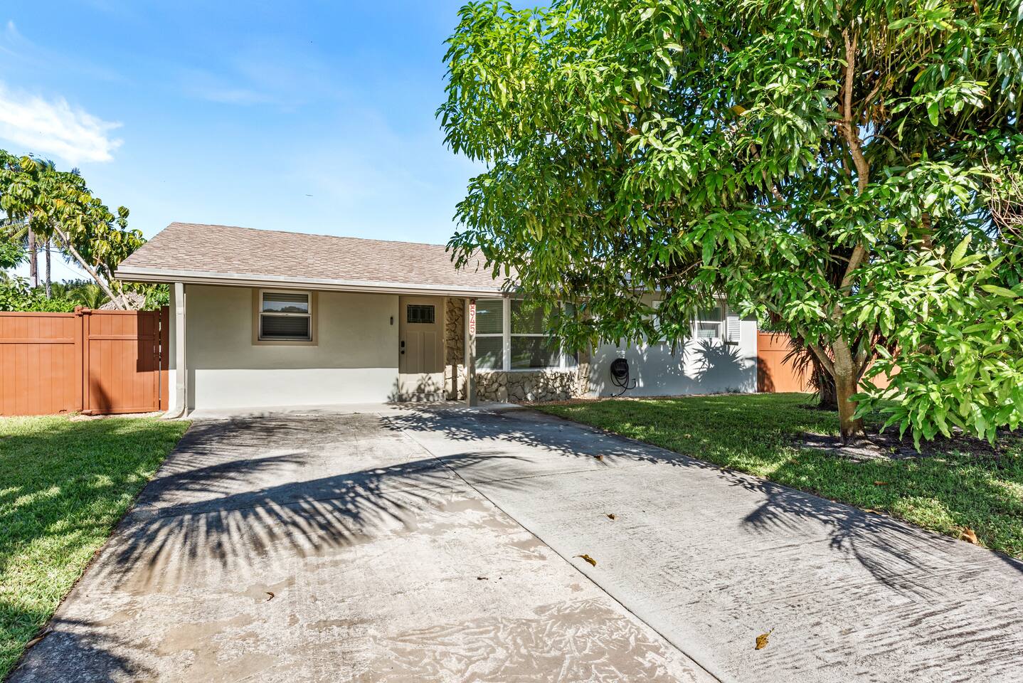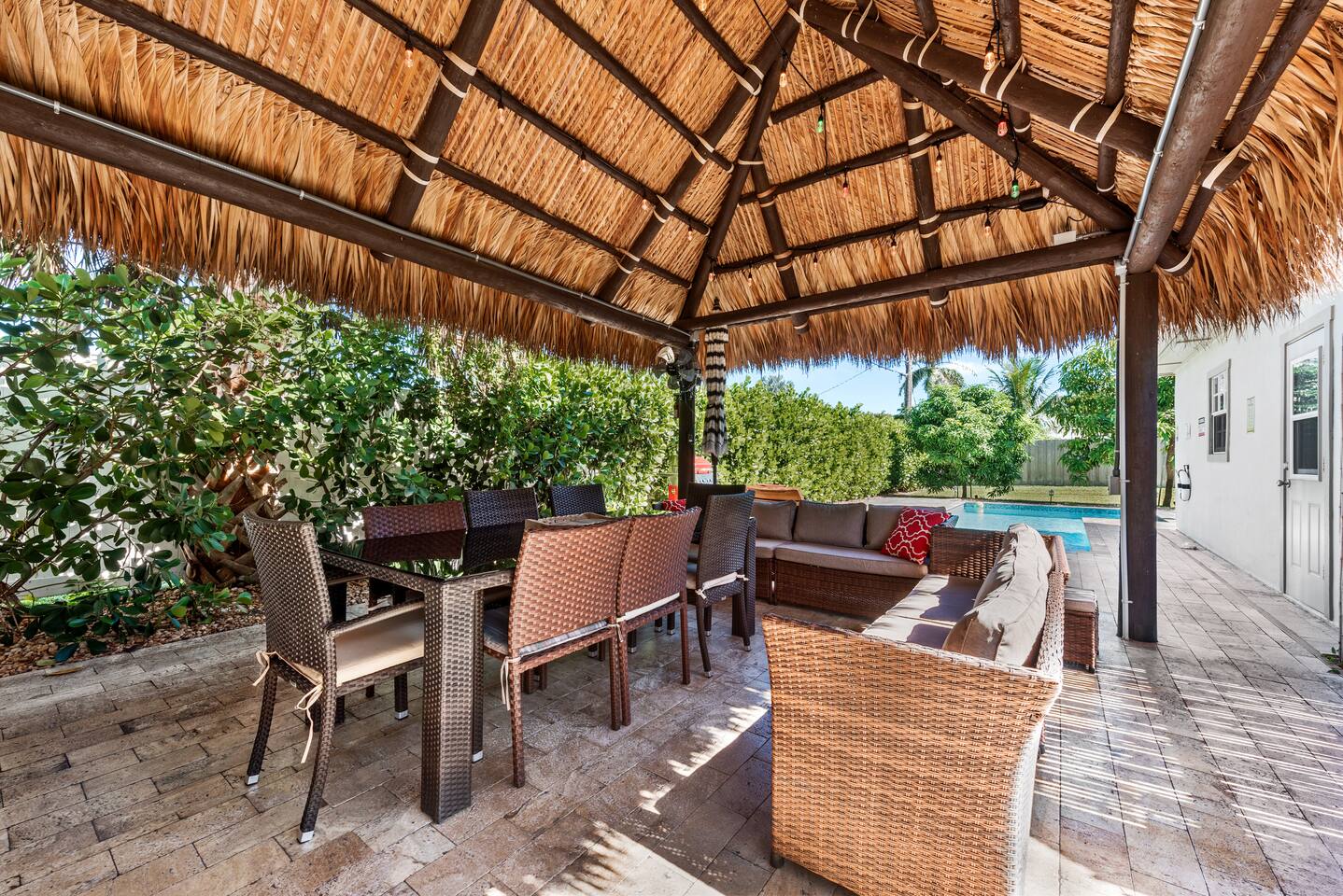 This tropical 4-bedroom family retreat combines a bohemian vibe with modern comfort. Enjoy a heated saltwater pool and a tiki hut equipped with lounge seating, dining, a bar with a mini-fridge, ceiling fans, a grill, and a TV—perfect for outdoor relaxation or entertainment. Inside, find TVs in every room, spacious accommodations, a full kitchen, and games. Surrounded by coconut and mango trees, this serene escape is just 10 minutes from the beach and 15 minutes from Palm Beach Airport.