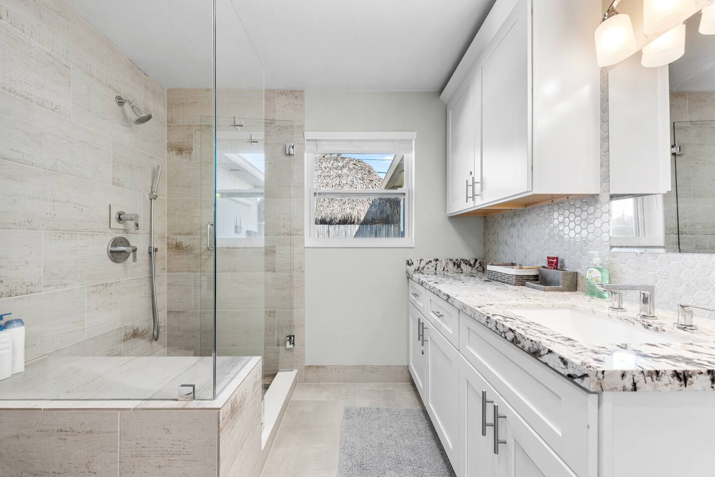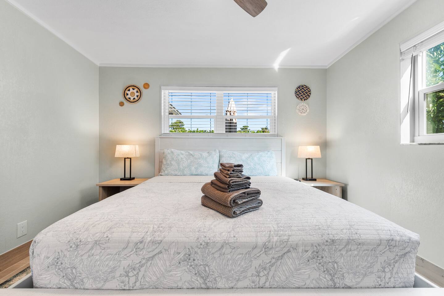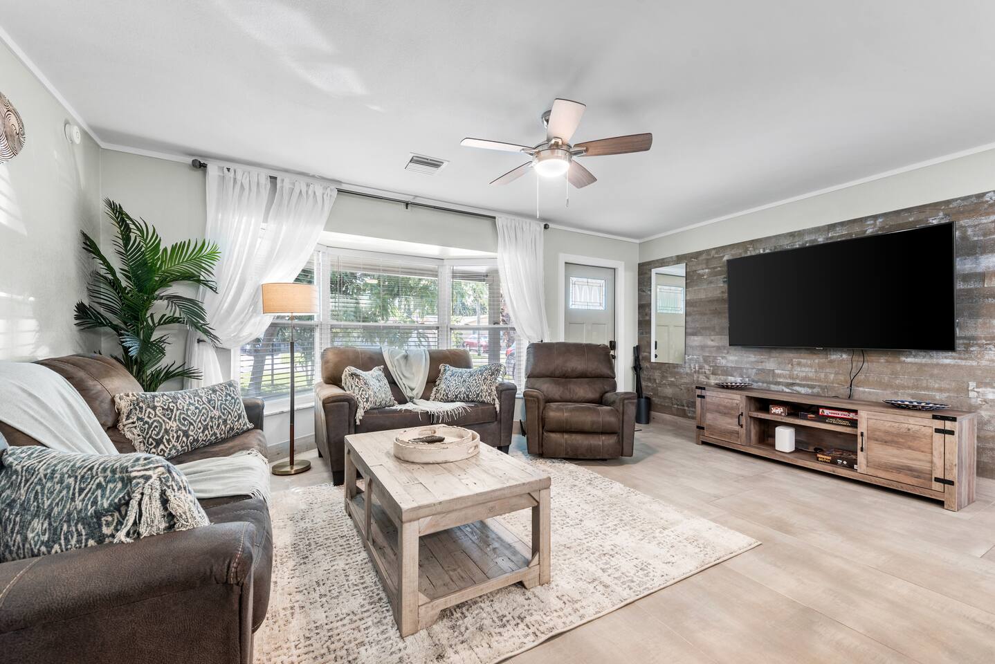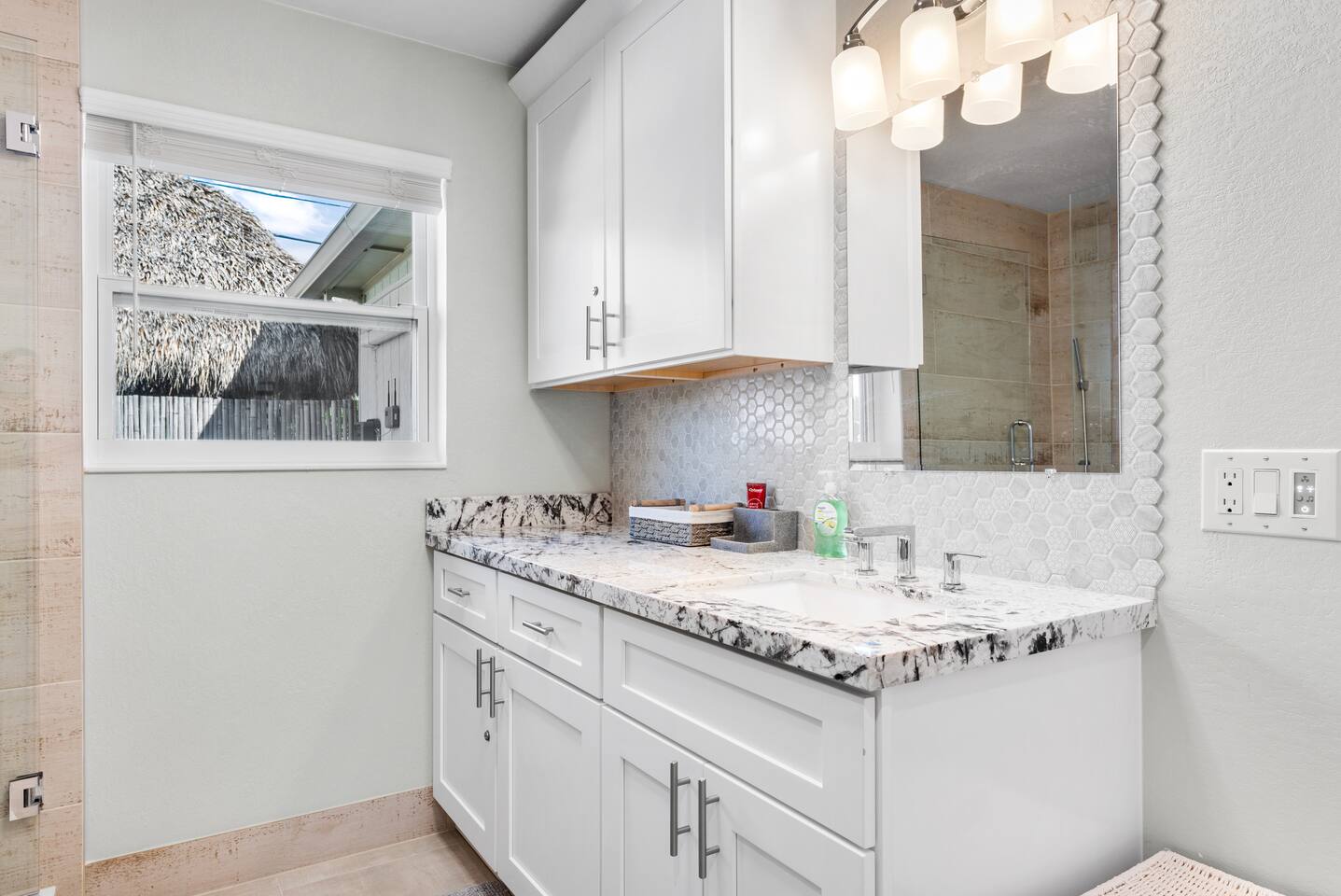 This tropical 4-bedroom family retreat combines a bohemian vibe with modern comfort. Enjoy a heated saltwater pool and a tiki hut equipped with lounge seating, dining, a bar with a mini-fridge, ceiling fans, a grill, and a TV—perfect for outdoor relaxation or entertainment. Inside, find TVs in every room, spacious accommodations, a full kitchen, and games. Surrounded by coconut and mango trees, this serene escape is just 10 minutes from the beach and 15 minutes from Palm Beach Airport.