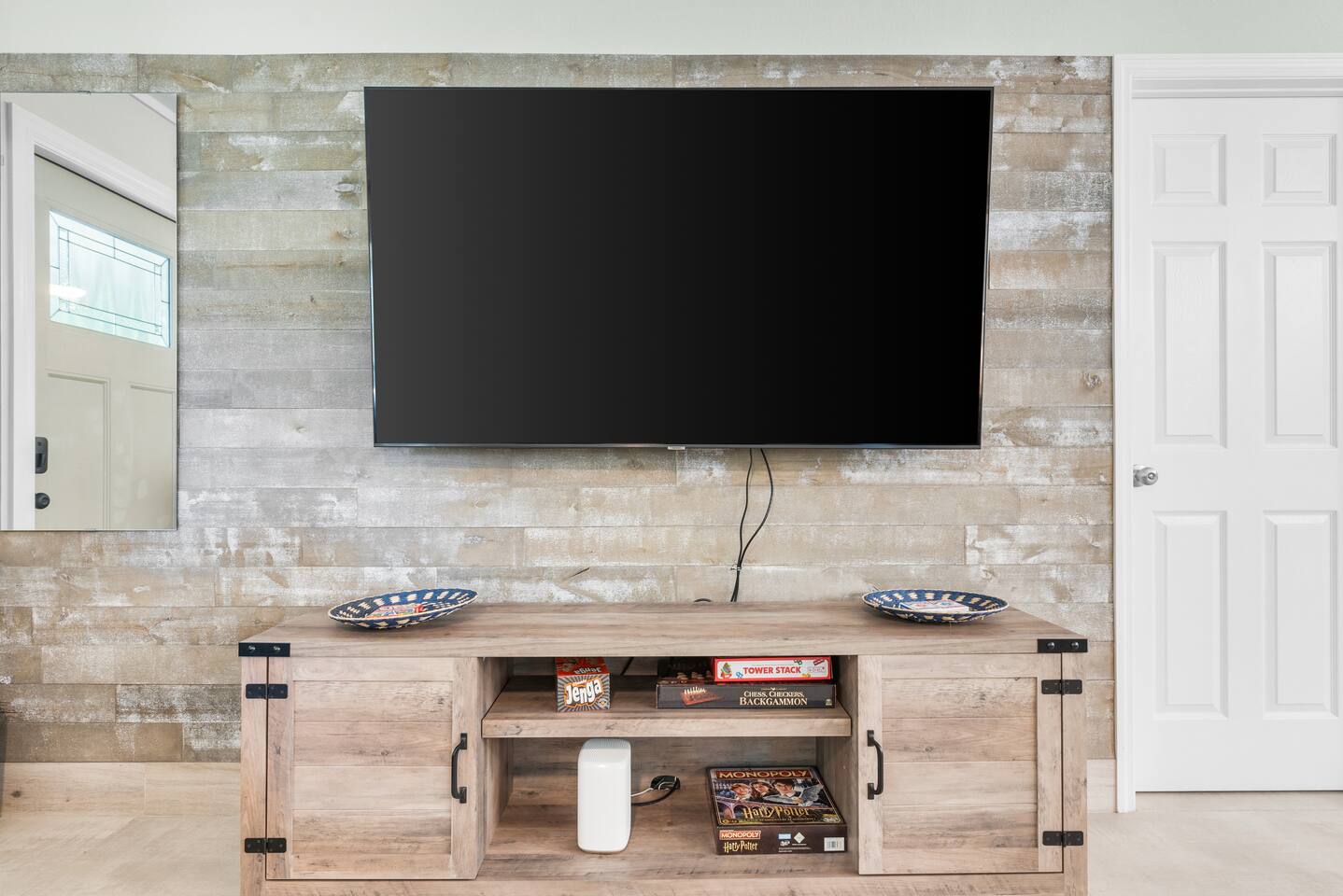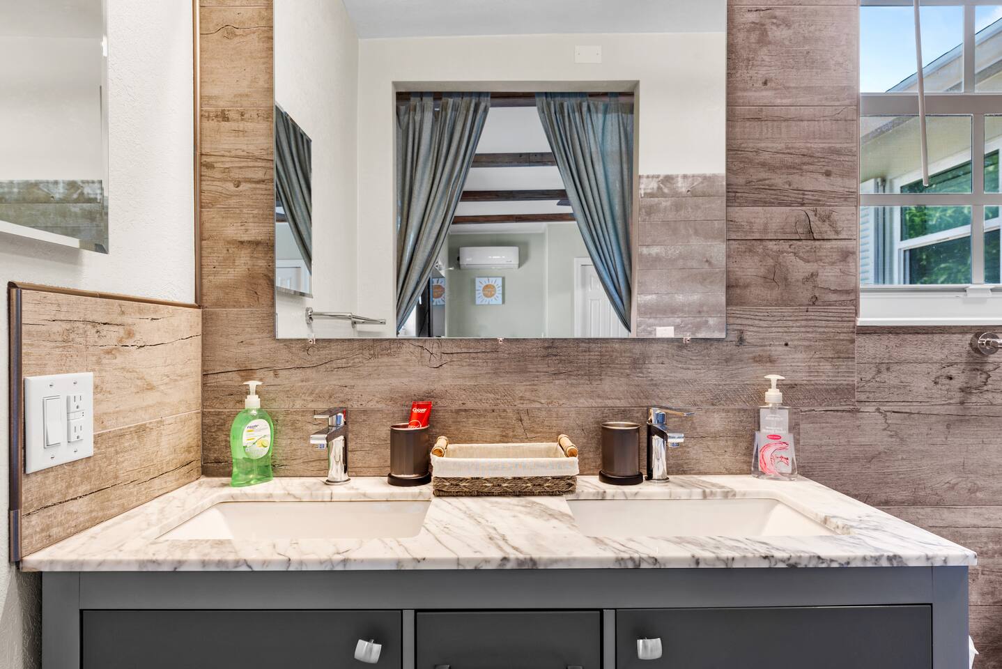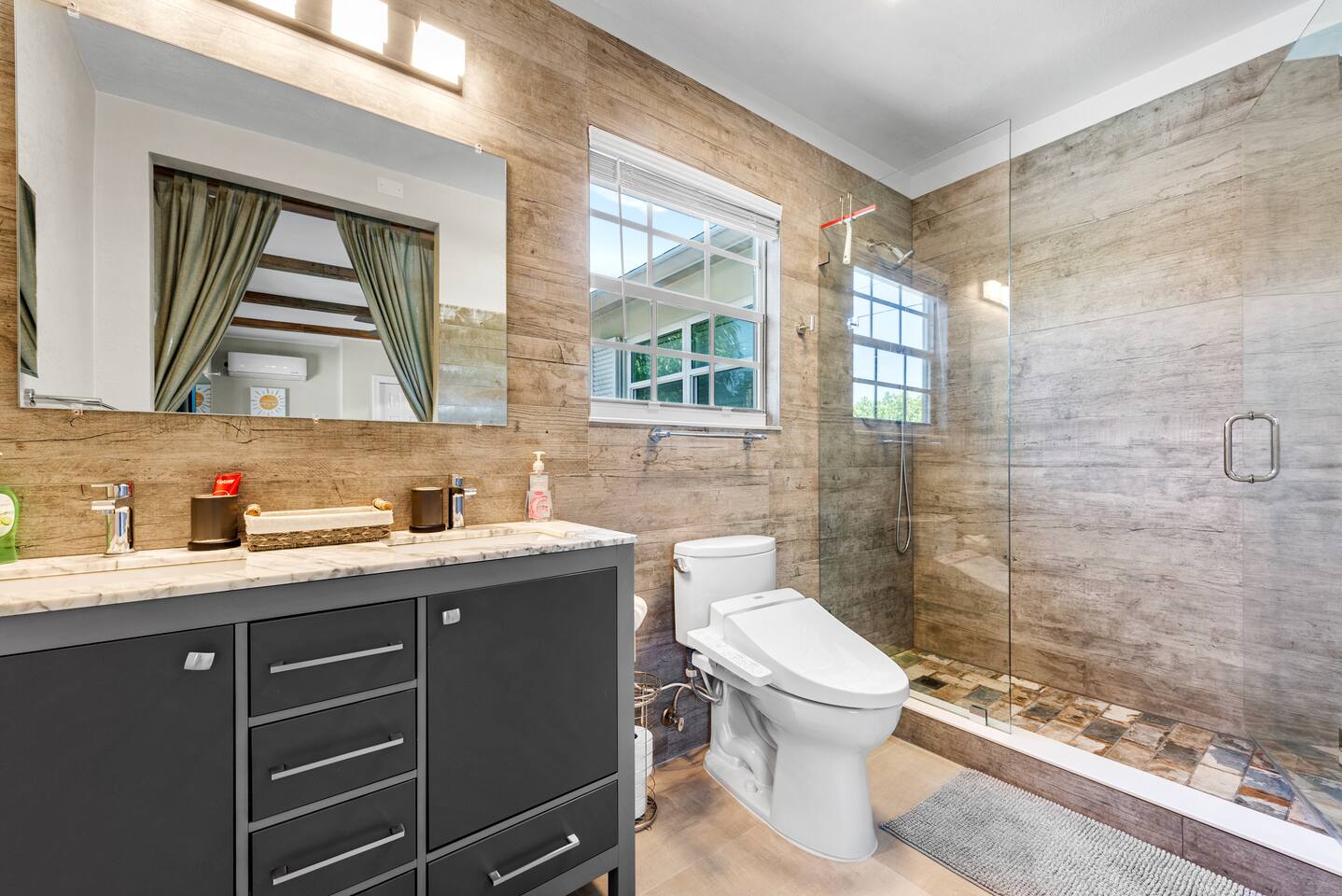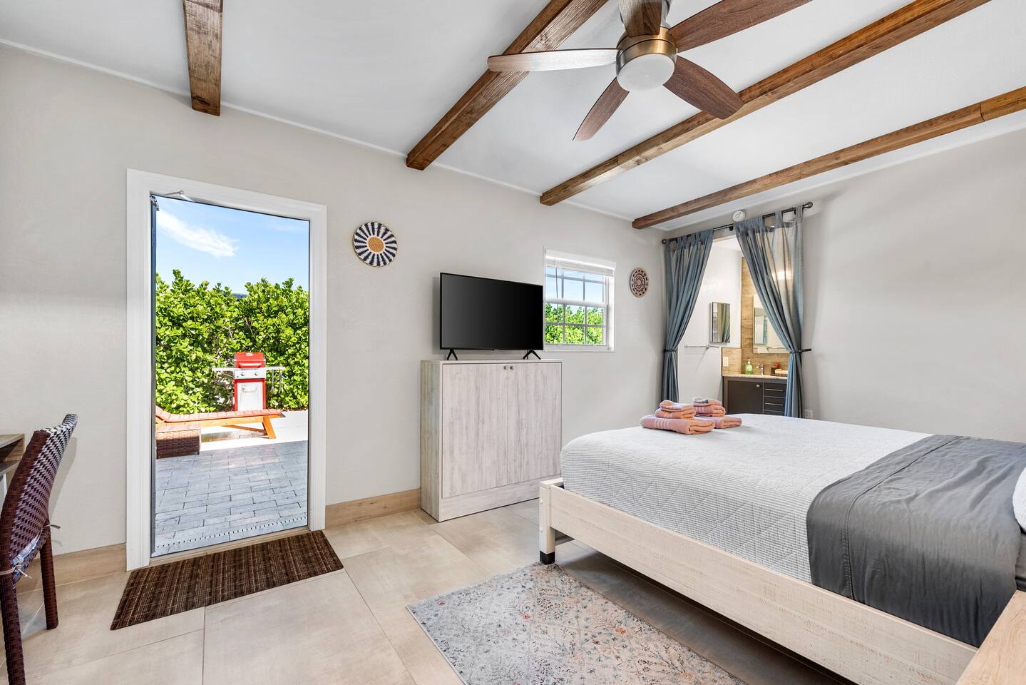 This tropical 4-bedroom family retreat combines a bohemian vibe with modern comfort. Enjoy a heated saltwater pool and a tiki hut equipped with lounge seating, dining, a bar with a mini-fridge, ceiling fans, a grill, and a TV—perfect for outdoor relaxation or entertainment. Inside, find TVs in every room, spacious accommodations, a full kitchen, and games. Surrounded by coconut and mango trees, this serene escape is just 10 minutes from the beach and 15 minutes from Palm Beach Airport.